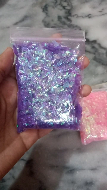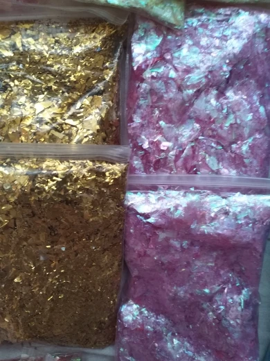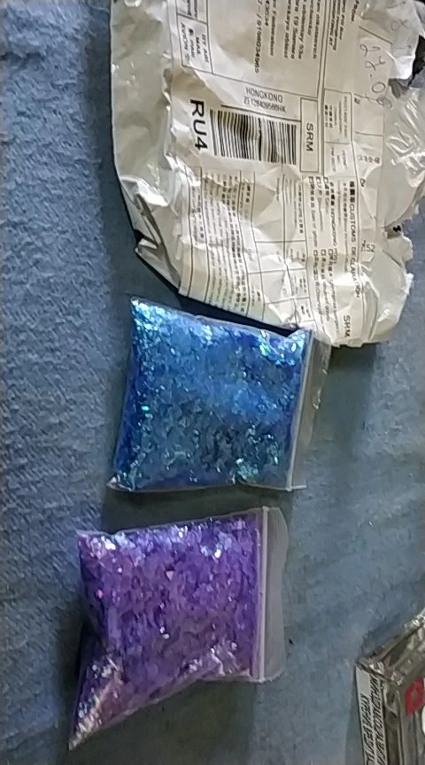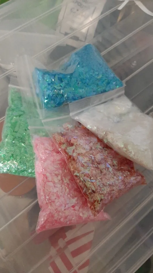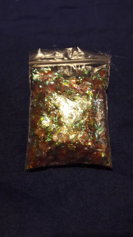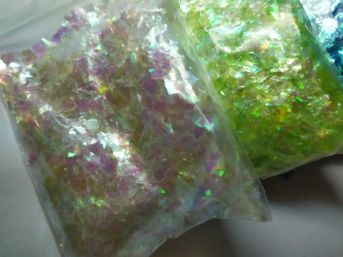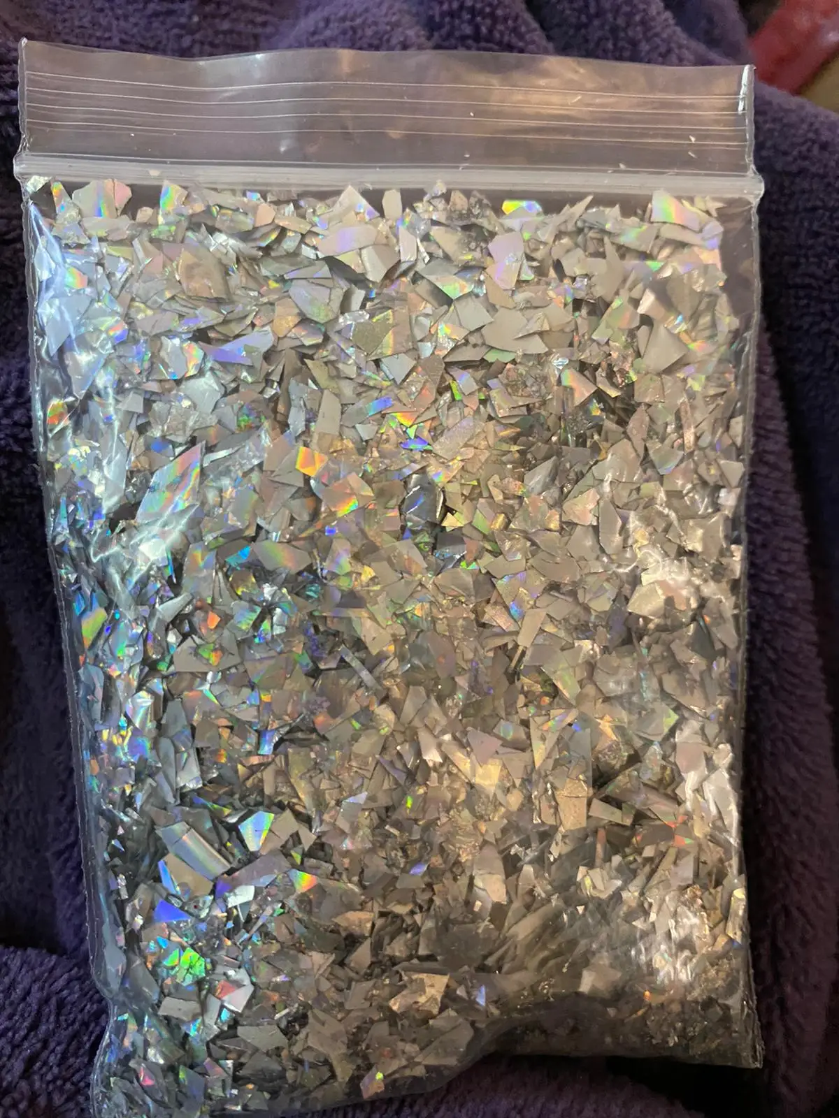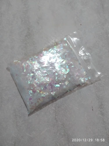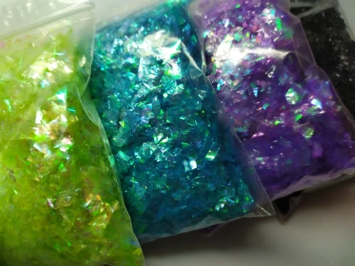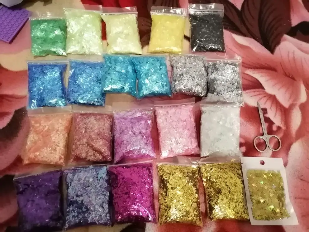 Блёстки выглядят не совсем так, как я ожидала, но с описанием совпадает, так что проблема с моей фантазией) Похоже на разрезанный фантик или мишуру. Размер кусочков разный, от сантиметра по одной из сторон до практически пыли. Заказывала для эпоксидки, прикольно) Хочу взять ещё пару цветов (у меня золотой)
