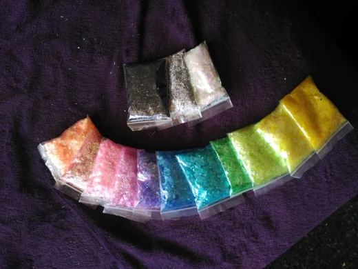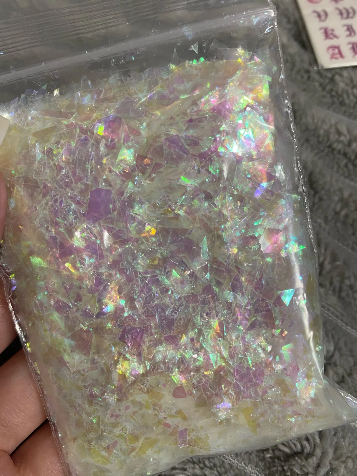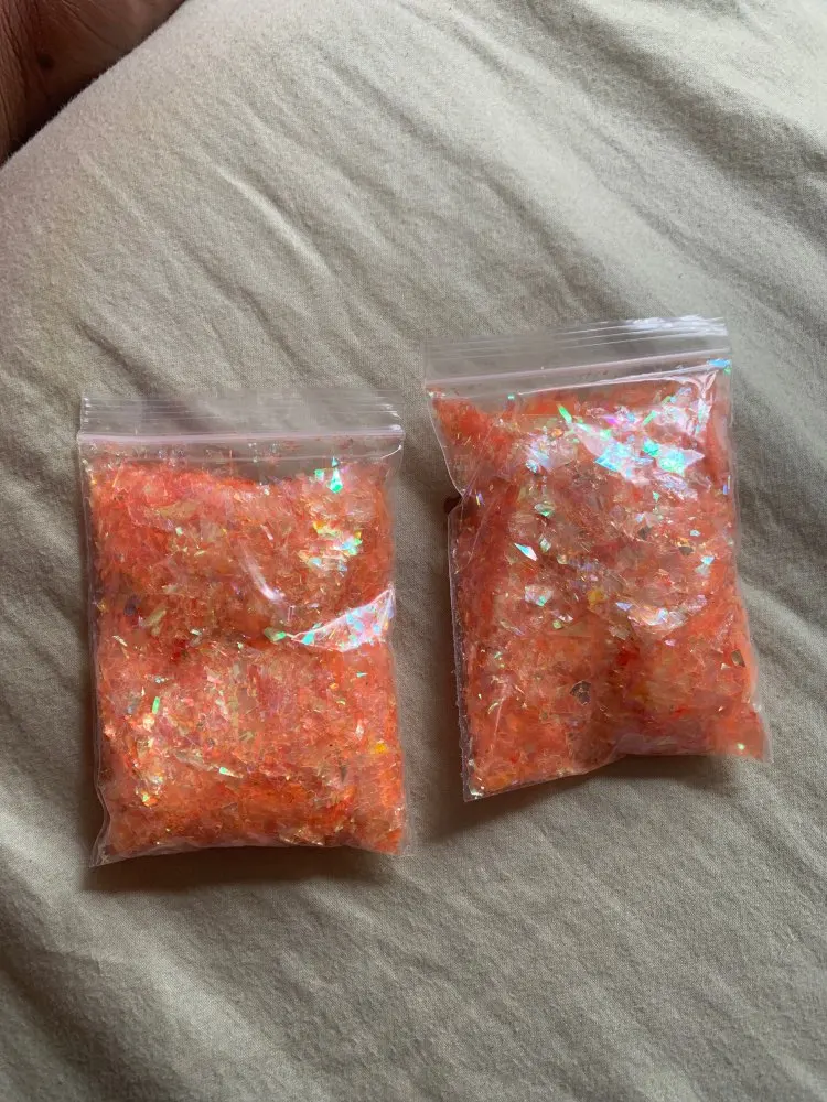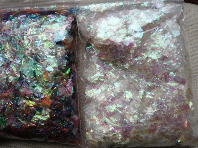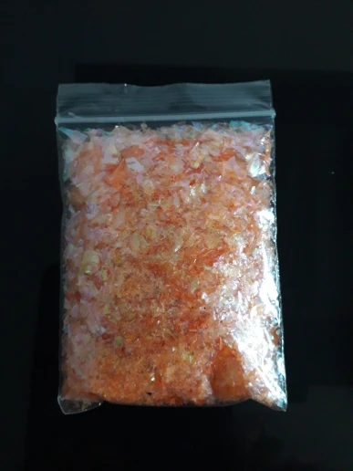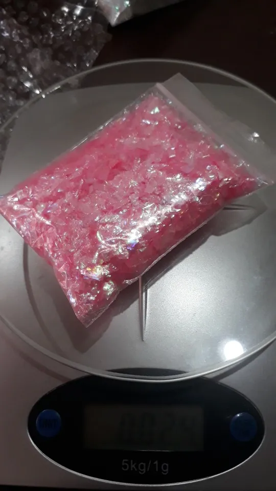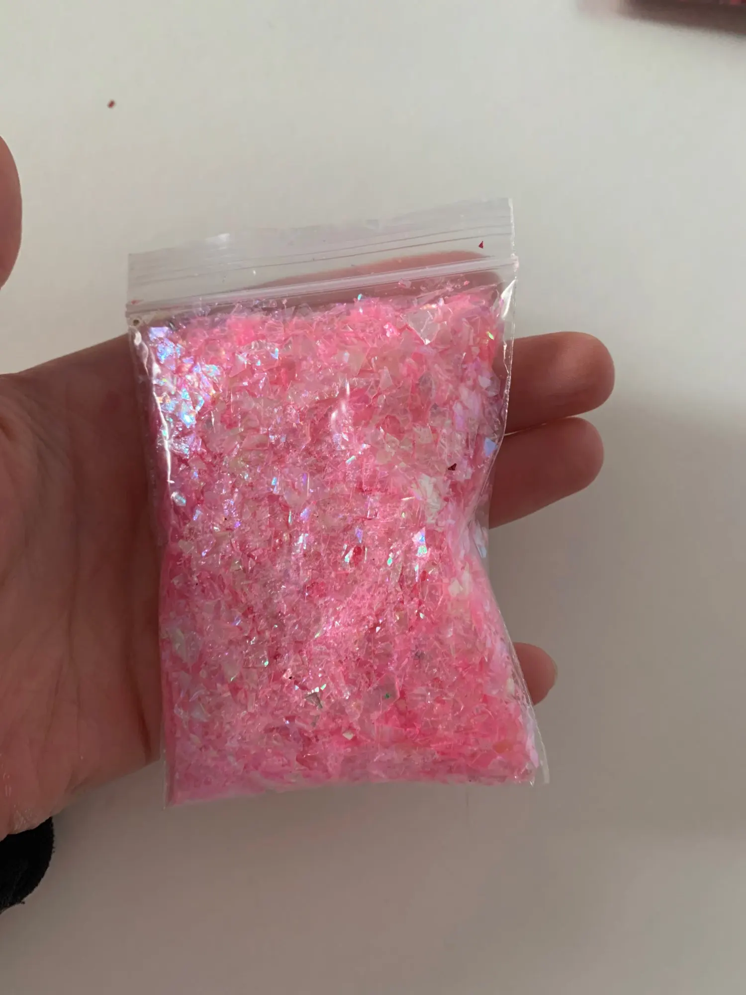 Блёстки выглядят не совсем так, как я ожидала, но с описанием совпадает, так что проблема с моей фантазией) Похоже на разрезанный фантик или мишуру. Размер кусочков разный, от сантиметра по одной из сторон до практически пыли. Заказывала для эпоксидки, прикольно) Хочу взять ещё пару цветов (у меня золотой)
