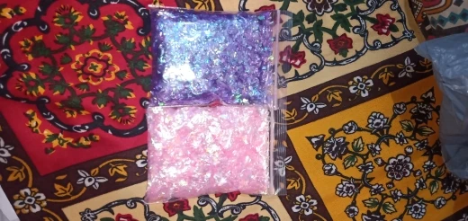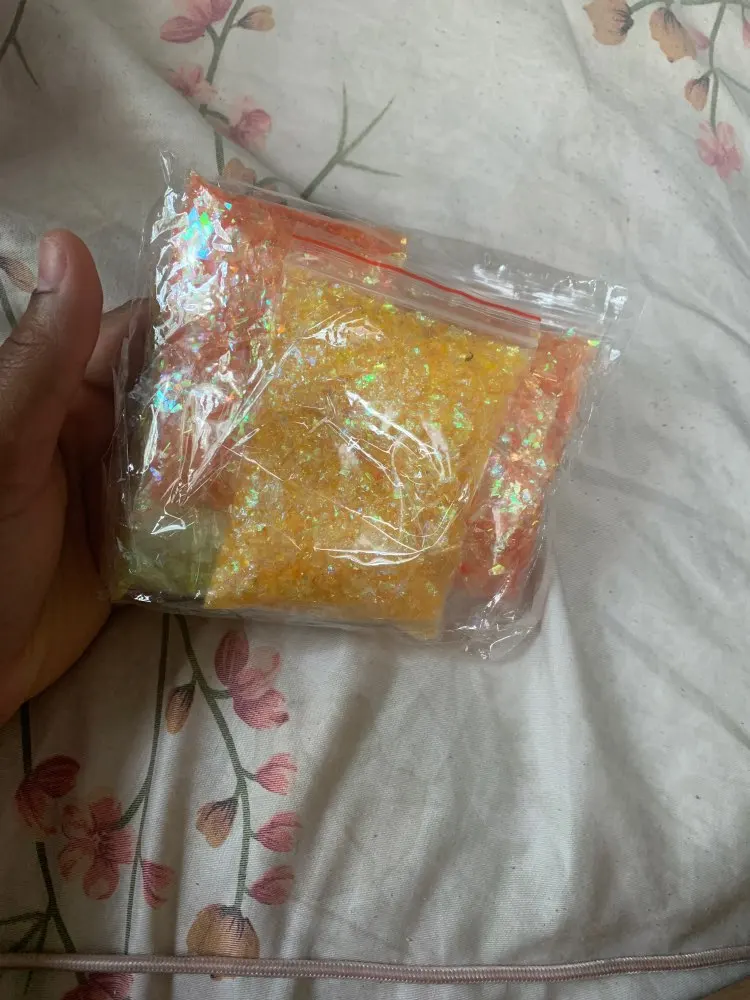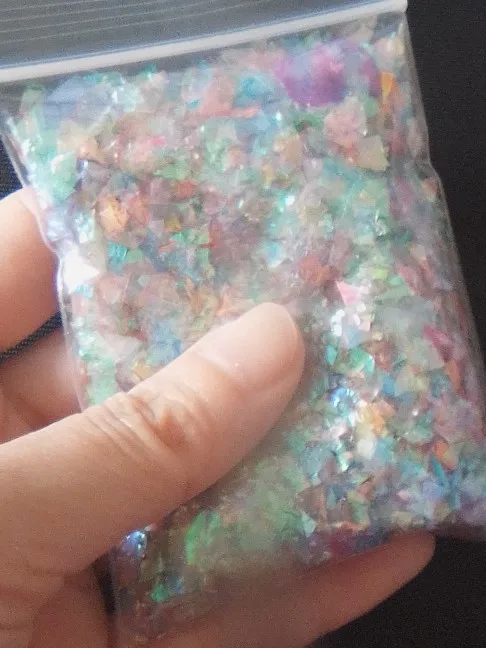 Целый пакетище блесток просто огонь. Тоненькие, не торчат, хорошо клеятся на липкий слой лака. Посыпались в упаковку немного но ничего страшного