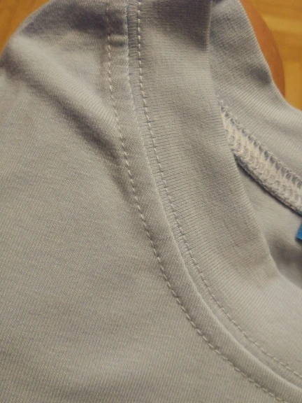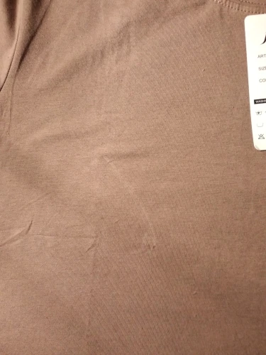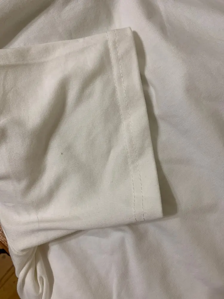 Доставка 17 дней с момента заказа. Размер великоват на российский 46. Горловина очень свободная. Цвет не белоснежный, ткань плотная. Неплохо.