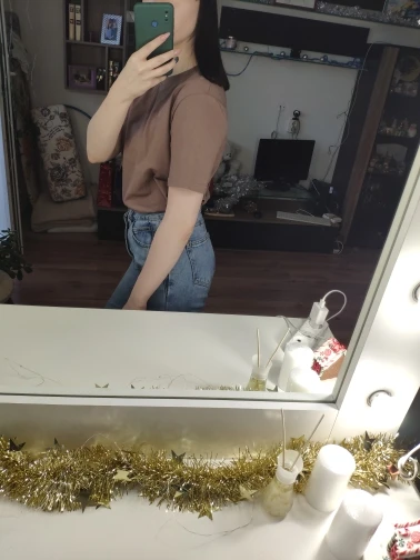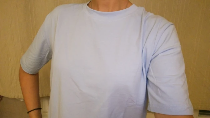 Ставлю 5 звёзд, но есть один минус для меня. Плотность ткани. Я ожидала плотный, даже жесткий хлопок. А на деле ткань тянется и не слишком плотная. Прошита идеально. Сидит хорошо. Мой вес 58, брала М. Обхват груди 90 без белья, талия 75. Заказывала белый цвет. Цвет не чисто белый, ближе к тёплому, как шампань. В целом считаю, что футболка хорошая, стоит своих денег. Но из-за плотности все таки расстроилась.