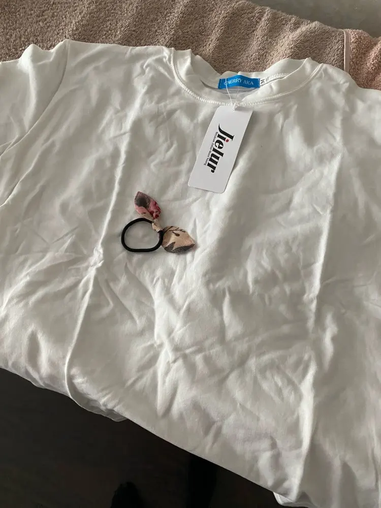 Хорошая футболка, тянется. Цвет слегка бежевый. В подарок резинка. На 46 L не оверсайз а как обычная футболка, возможно в следующий раз возьму XL