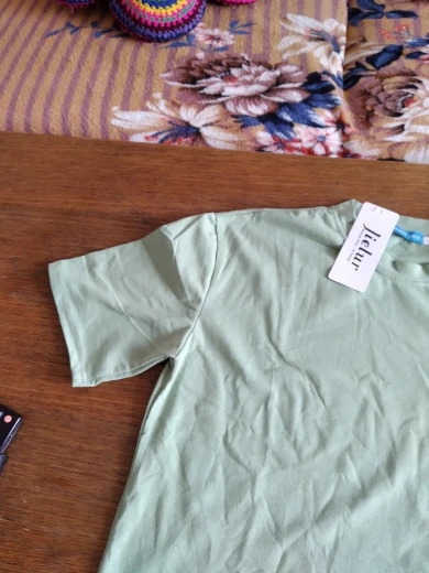 Доставка в СПб за 6 дней. Хорошая футболка, нежный, приятный цвет. Строчки ровные, запаха нет, торчащих ниток нет. Но на редкость, есть бирки с составом и рекомендациями по стирке. Посмотрим как переживёт стирку. На параметры 84/63/88, рост 165 взяла S. Продавец положил подарочек. Спасибо