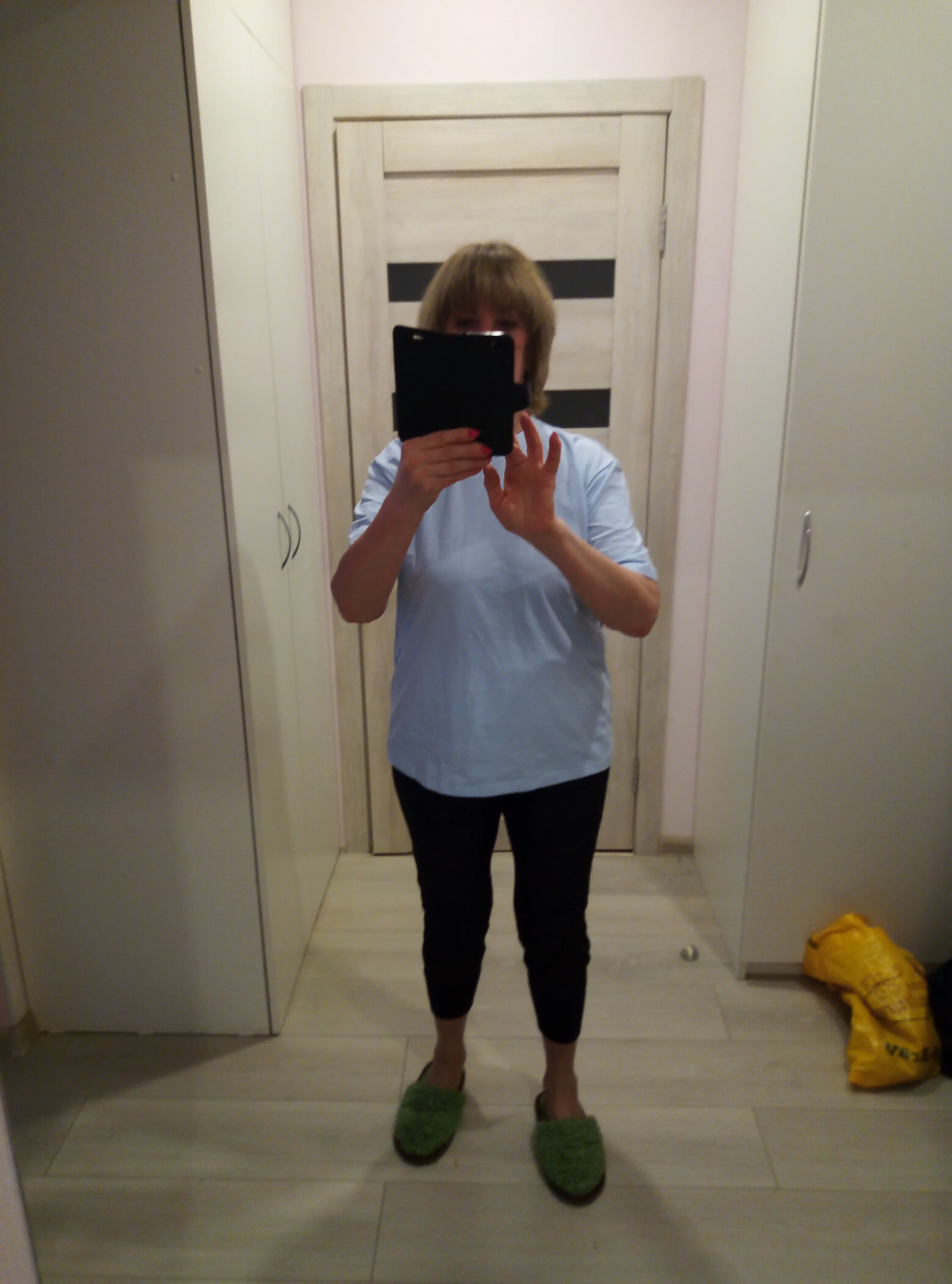 Ткань плотная, мягкая, не просвечивает. Пару раз уже стирала, с футболкой все хорошо, нитки не повылазили. Размер М на мой S сел хорошо, немного свободная, как я и хотела