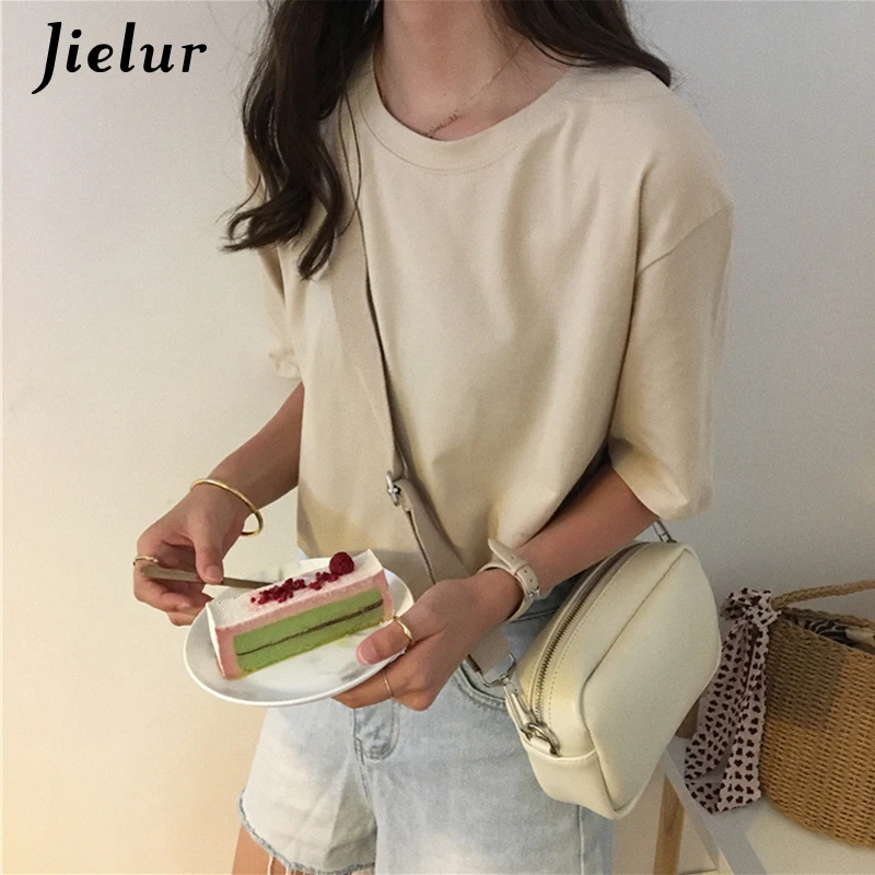Jielur Футболка Женская Базовая однотонная Повседневная рубашка с круглым вырезом в стиле Харадзюку топ в Корейском стиле в хипстерском стиле цвет белый