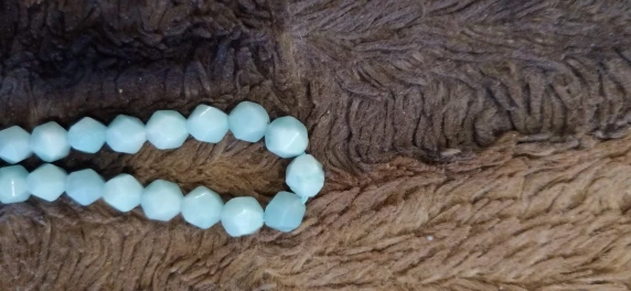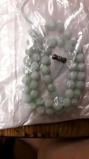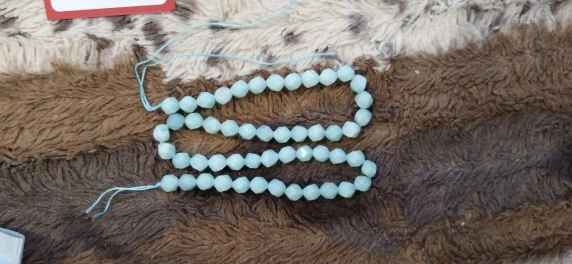 Получила это изделие всего за 0,73руб в разделе "почти даром" (халява). На синтетической нити голубого цвета нанизана 51 огранённая бусина, по ощущениям натуральный камень. Бусинки красивого бледно - голубого цвета, даже бледно бирюзового. За счёт граней красиво поблёскивает, видны рисунок и текстура камня. Бусинки не идеальные, некоторые имеют значительные изъяны и неровности несмотря на огранку, но меня это не смущает, только придаёт шарма на мой взгляд. В комплекте металлическая застёжка, которую при желании можно сразу зафиксировать. С продавцом не общалась, не было необходимости. Подтверждено, отправлено и доставлено вовремя.