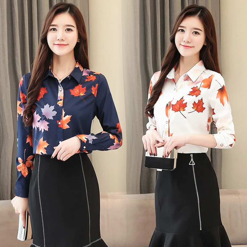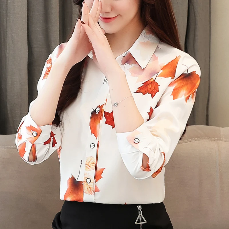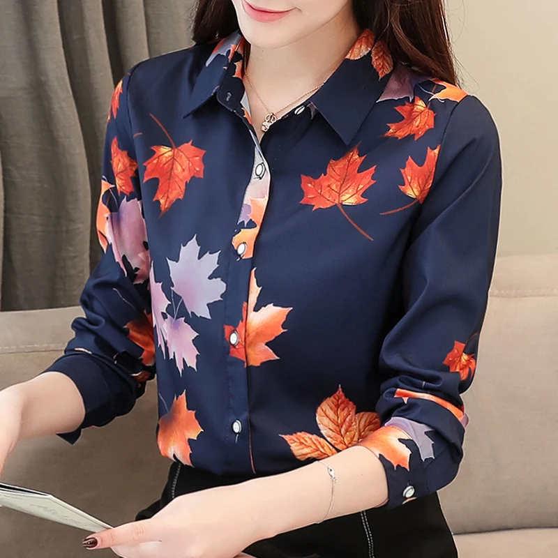 женские топы 2018 шифоновые женские блузки офисные женские с отложным воротником с цветочным принтом на пуговицах с рукавами длинными 2073 50