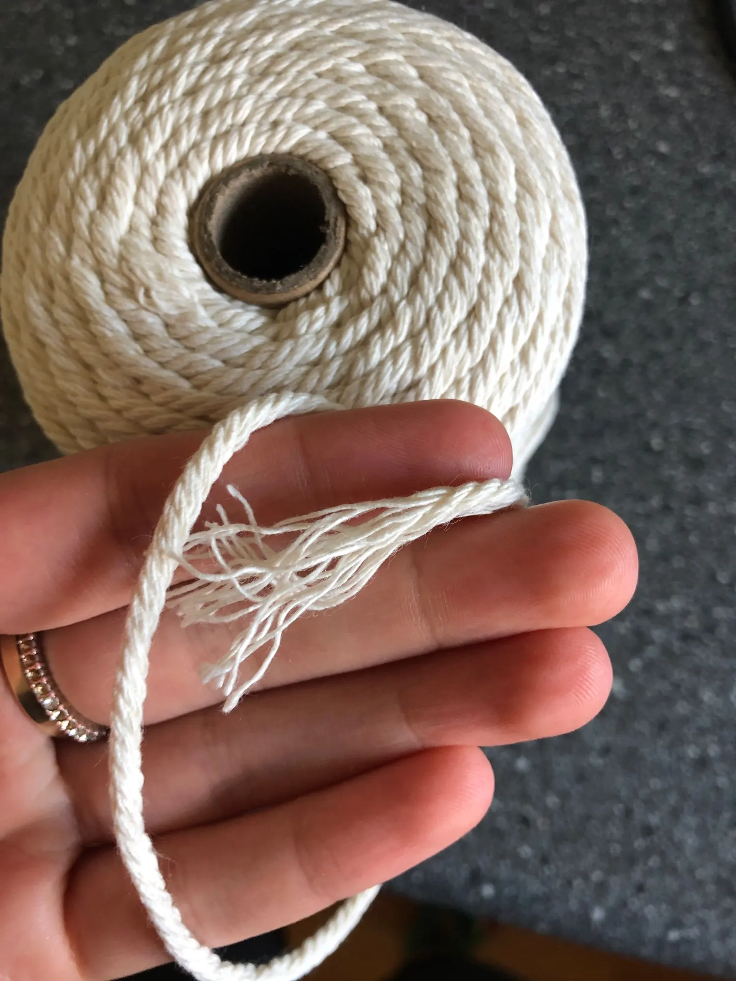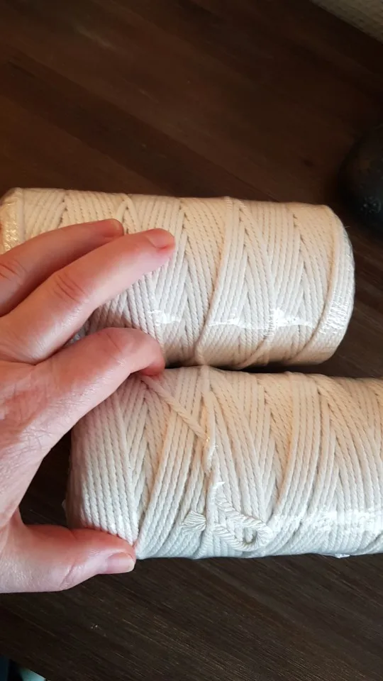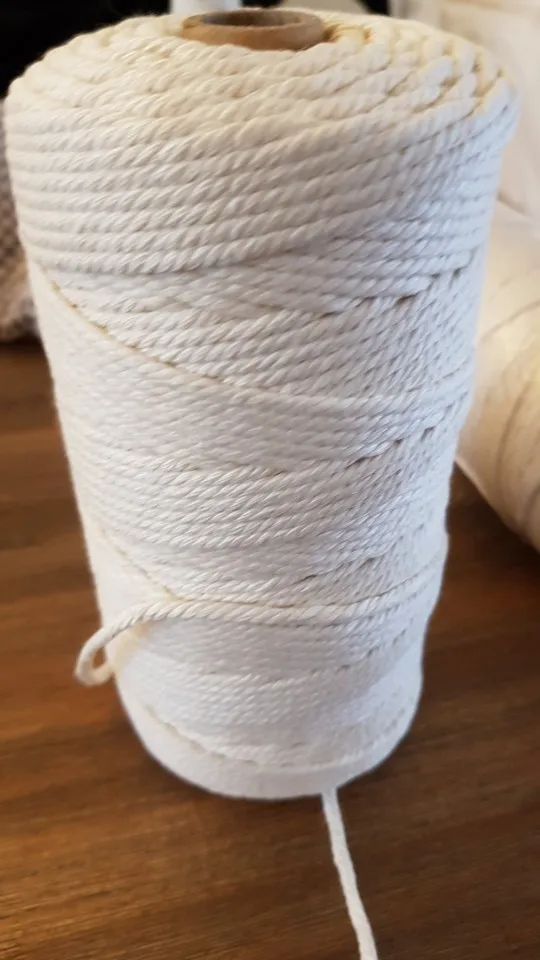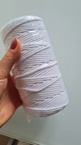 Соединение нити не чистое или узкое или отслаивается, потому что соединение не очень хорошее, что-то еще (не много и не очень долго) принесите остатки другой ткани другого цвета ни в коем случае темно-серого цвета. Он тоньше 3 мм, ему не хватает почти 50 метров, чтобы достичь 200 м, что говорит, что он приносит. Нить изготовлена из хлопка только одной закрученной кабеля. Я заказал его белым, и он очень белый, цвет красивый, а качество хорошее. Я смог сделать свой проект макраме, и конечный результат был хорошим.