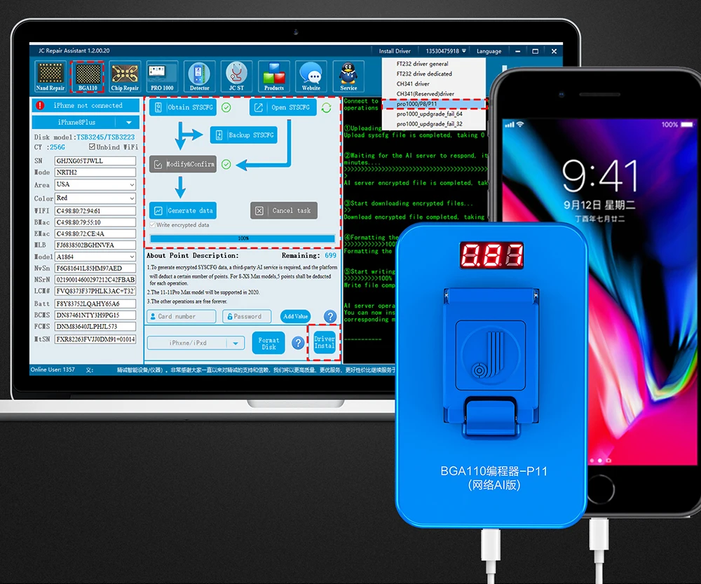 Поддержка BGA110 NAND SYSCFG модификация и запись данных, отключение WIFIСовершенно новый NAND не требует восстановления прошивки устройства, поддержка записи данных SYSCFG непосредственноИсправьте ошибку 35 во время восстановления прошивки для BGA110 NANDИсправьте ошибку данных для BGA110 NANDПоддержка 8-XS Max в настоящее время, бесплатное обновление программного обеспечения для поддержки 11-11Pro Max для будущегоИнициируйте режим сетевой зарядки, можете приобрести точки в соответствии с требованием, что значительно экономит инвестиционные затраты на оборудование.