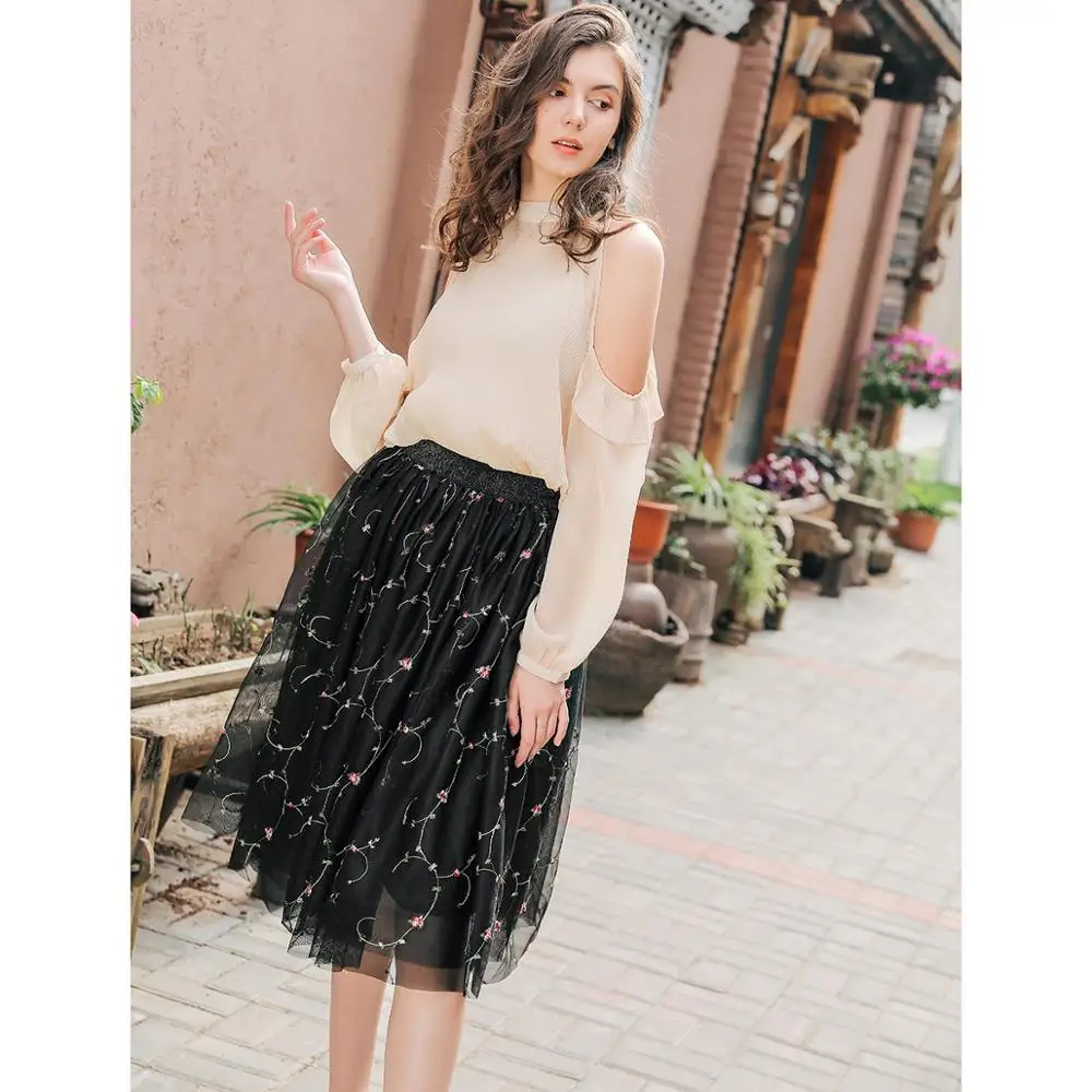 Женская фатиновая юбка с вышивкой, черная или белая юбка-пачка с высокой талией и цветочным принтом, в винтажном стиле, 2021