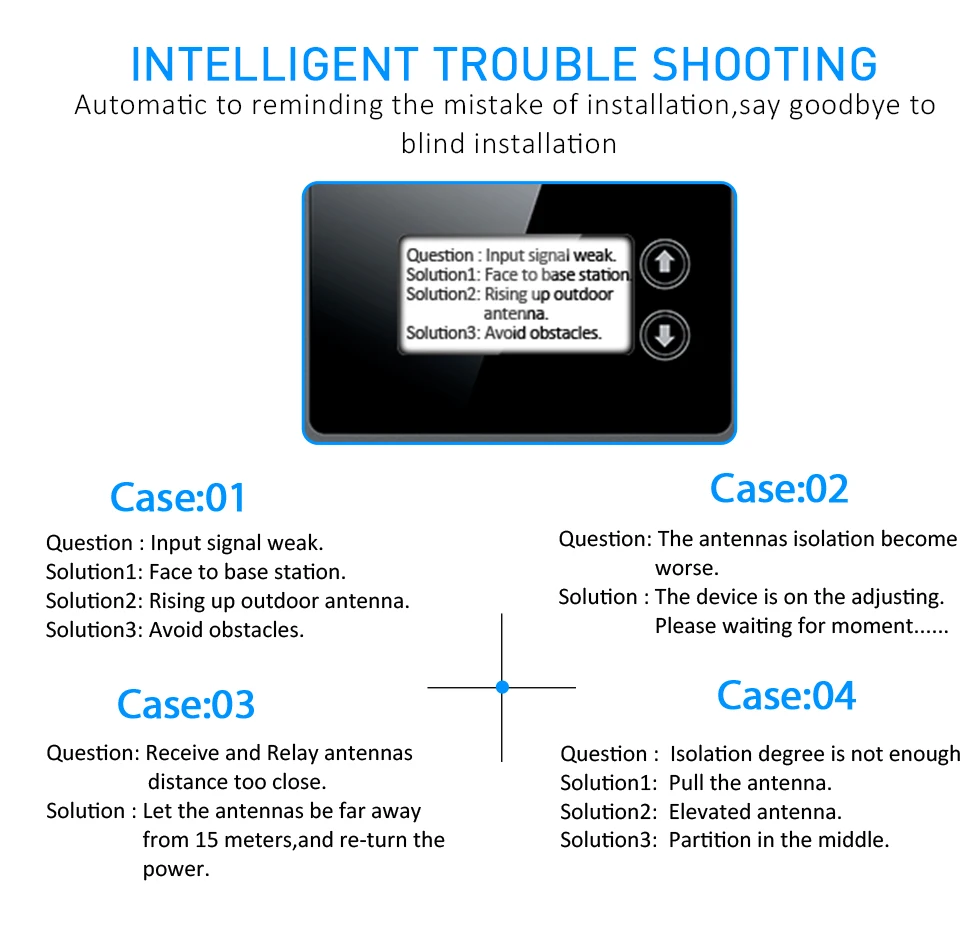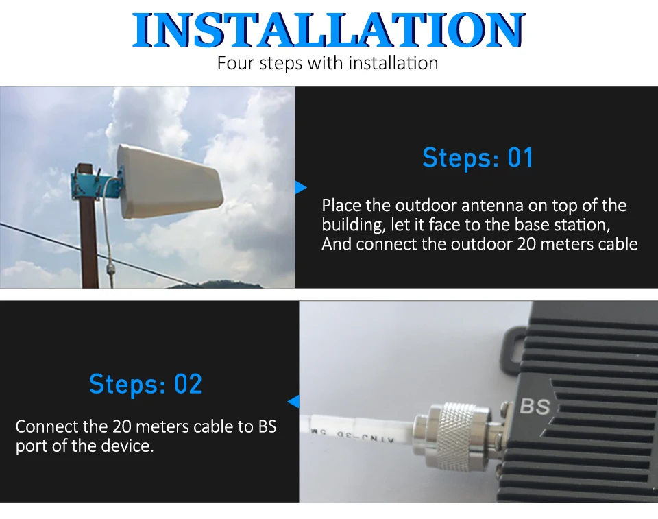 1. Поместите наружную антенну на верхнюю часть здания, подключите ее к базовой станции и подключите внешний 20-метровый кабель.2. Подключите 20-метровый кабель к порту «BS» устройства.3. Прикрепите комнатную антенну к потолку, Подключите Внутренний 5-метровый кабель для анимации. Порт «MS» устройства и внутренняя потолочная антенна.4. Убедитесь, что все соединение готово, включите устройство, завершите установку.