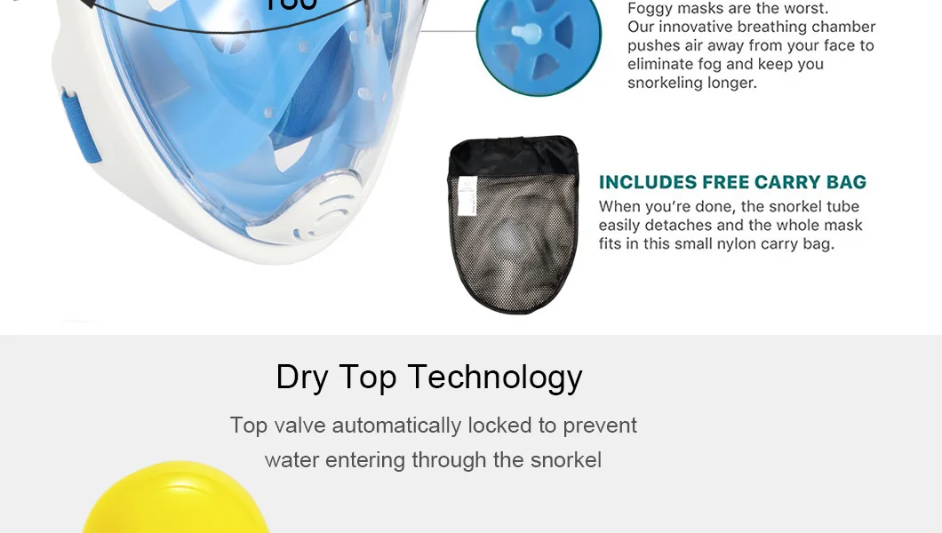 Технология сухого верха:Он оснащен двойным плавающим шаром, который будет запечатывать верхнюю часть трубки при погружении в воду, предотвращает попадание соленой воды в дыхательную трубку;