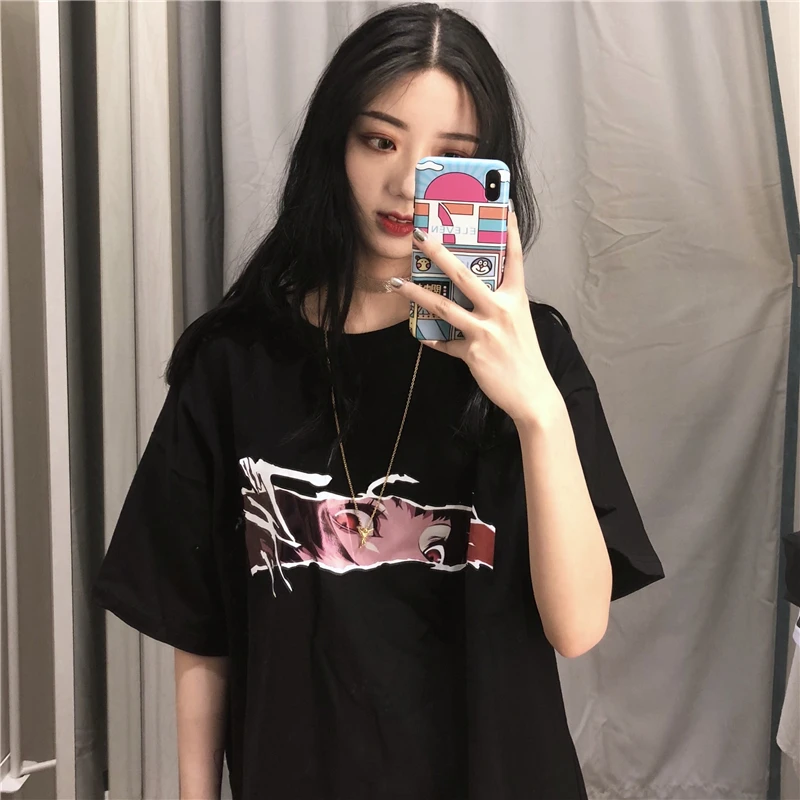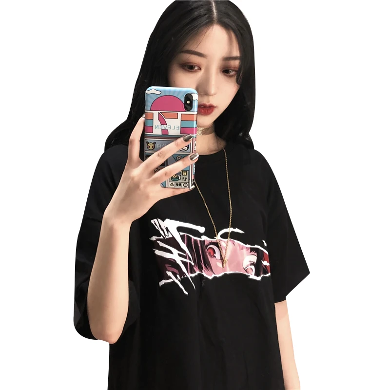 Летние женские футболки, одежда в Корейском стиле, рубашки в стиле ольччан Харадзюку, повседневная черная футболка с мультяшным принтом, женские свободные футболки
