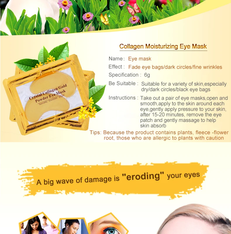 1 устраняет темные круги и тонкие морщины-100% коллагена и других минериалов, присутствующих в маске для глаз, ускоряет омоложение клеток и коллагена. Это повышает эластичность контура глаз, уменьшая при этом мешки под глазами и такие проблемы, как темные кольца и тонкие линии. 2 для упругого и сверкающего контура глаз 3 снимает усталость глаз 4 10X технология поглощения растворяется при попадании тепла 5. Основным ингредиентом является натуральный коллаген из кактуса. Коллагеновая маска не содержит слизи и не липкая. Питательные ингредиенты конденсируются внутри маски, быстро проникая в кожу, ощущают, как кожа, и мгновенно подтягивают и укрепляют. Направления: 1 очистите и высушите лицо 2. Снимите пластик с патча 3. Поместите патчи под глазами 4. Используйте 2-3 раза в неделю, носите около 30 минут 5. Удалите пластыри, не используйте их повторно Важные: 1. Избегайте использования на области рубцов или чувствительной коже 2. Прекратите использование, если вы испытываете дискомфорт 3 Хранить вдали от детей 4. Не используйте 1 пластырь более 12 часов