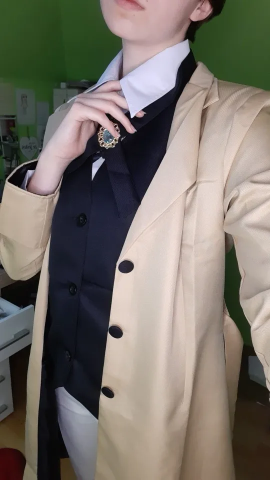 Косплей пришел быстро, недели за 2-3. Заказывала мужской S на 168 см, вес 45. Штаны были большими, а так все село хорошо! Имейте ввиду, что пальто имеет вставные подкладки в плечи, то есть они будут широкими. По качеству все тоже хорошо, опять же только штаны немного смущают. И сразу предупреждаю, в пальто нет карманов! Карманы есть только в штанах. Украшение Дазая на шею регулируется с помощью лепучки, но из-за того, что у меня тонкая шея, придётся переделывать. В общем рекомендую, за такую цену просто идеально!