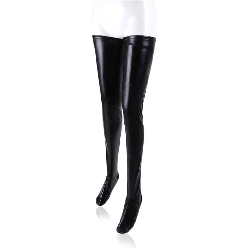 Сексуальные черные чулки до бедра из искусственной кожи с эффектом фетиша, с эффектом мокрого эффекта, с нескользящей вставкой, размера плюс