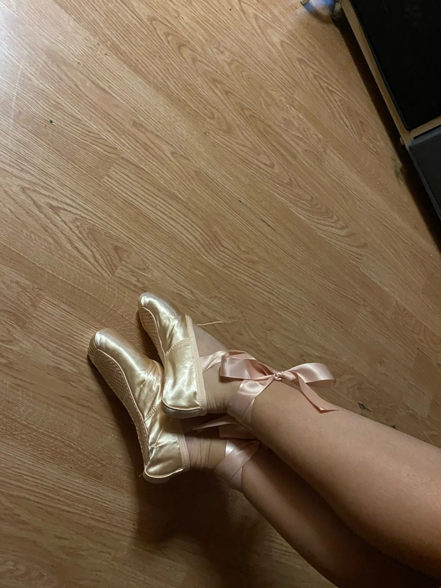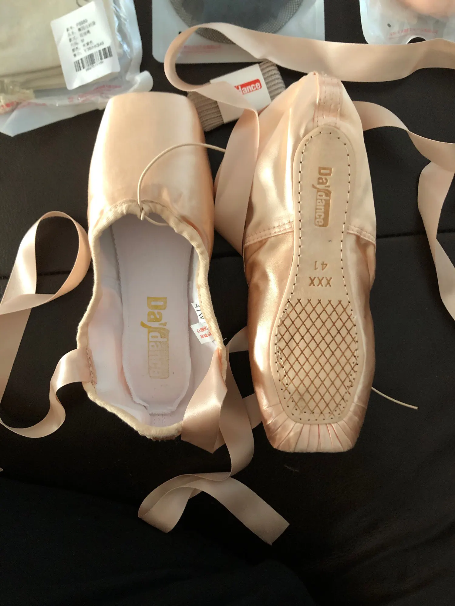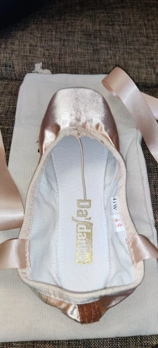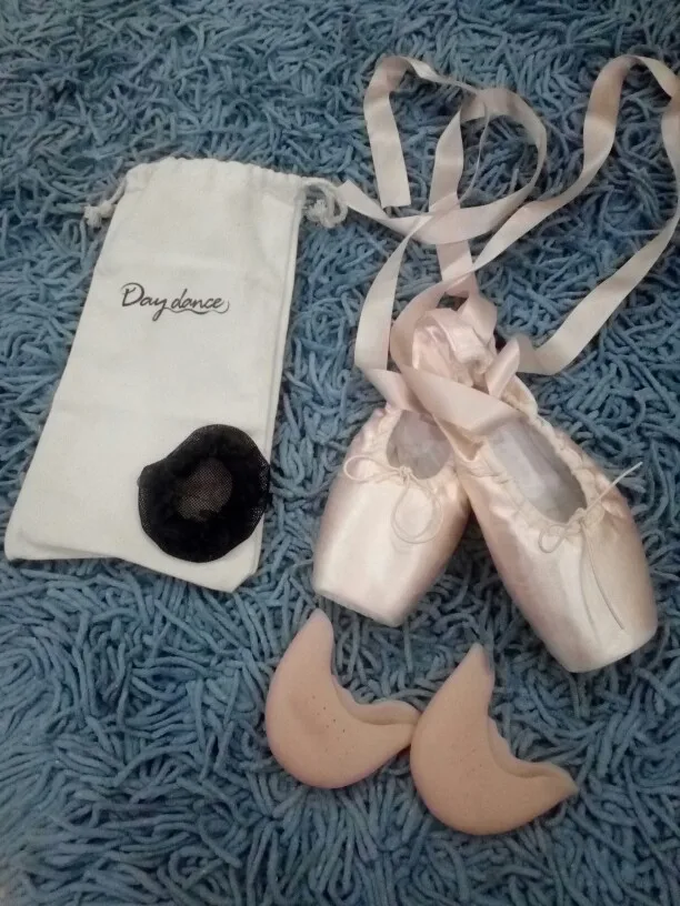 Вроде хорошо сделанные пуанты, дам примерить дочери. Заказала 17.11, пришли 7.12. В комплекте мешочек для хранения, какая то бумага. В подарок продавец положил сеточку. Пуанты с атласными лентами. В общем, мне очень нравятся