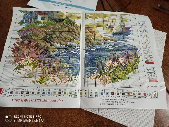 Вечная проблема этих наборов - схема на одном листе, приходится переворачивать. И коды ниток на нём же. Кстати, для этой схемы потребуется минимальное знание английского, ну или логика, чтобы отличить крестики от бэка и фрузелков. Но, думаю, с этим все справятся. Сама схема понятная, ниток вроде тоже достаточно, канва чистая, ровная, обверложена. Посмотрим, как все это будет в работе.