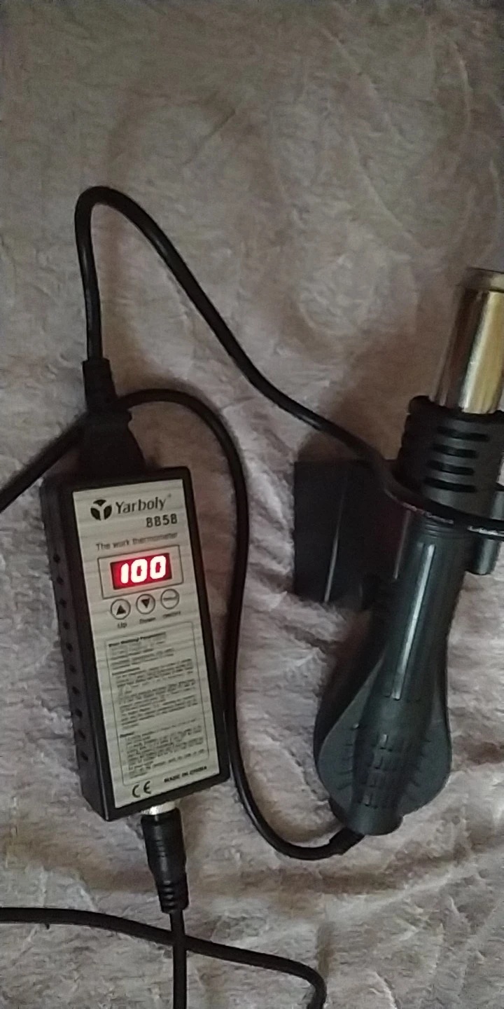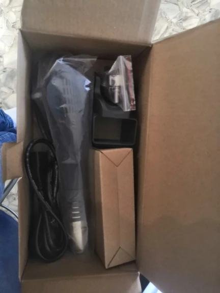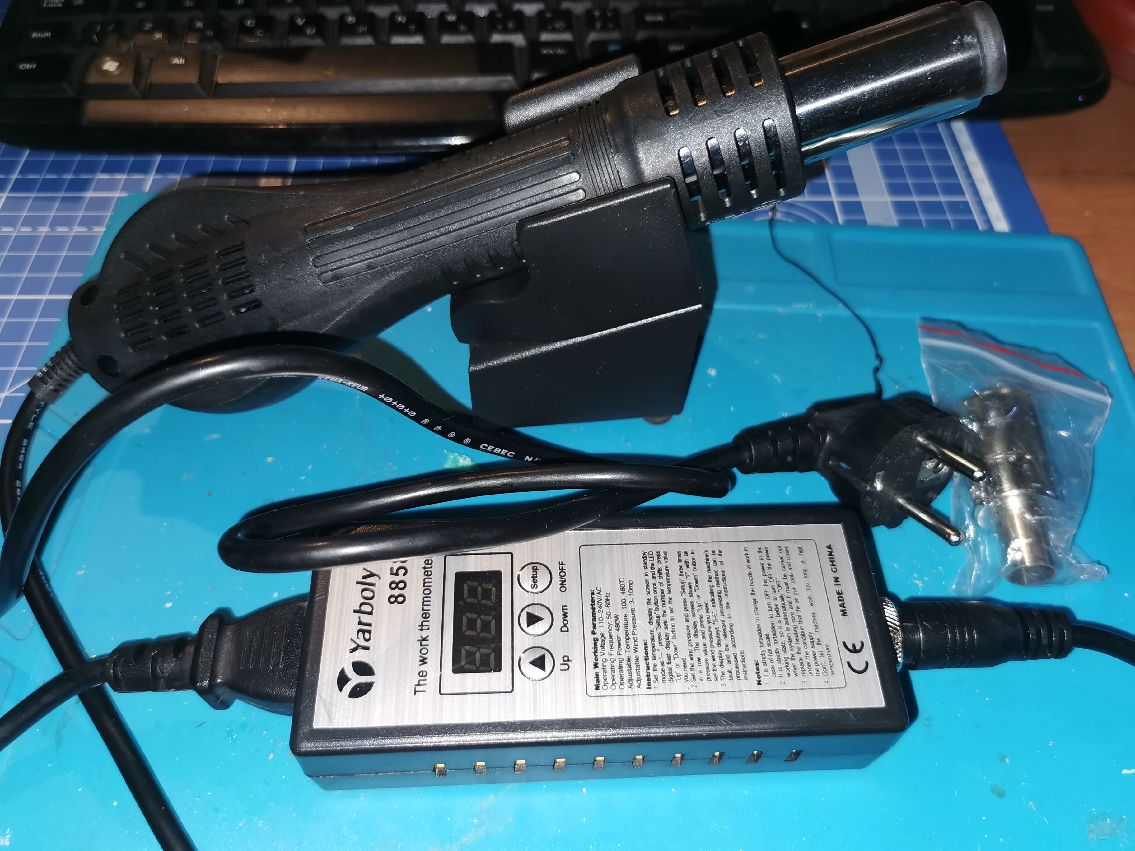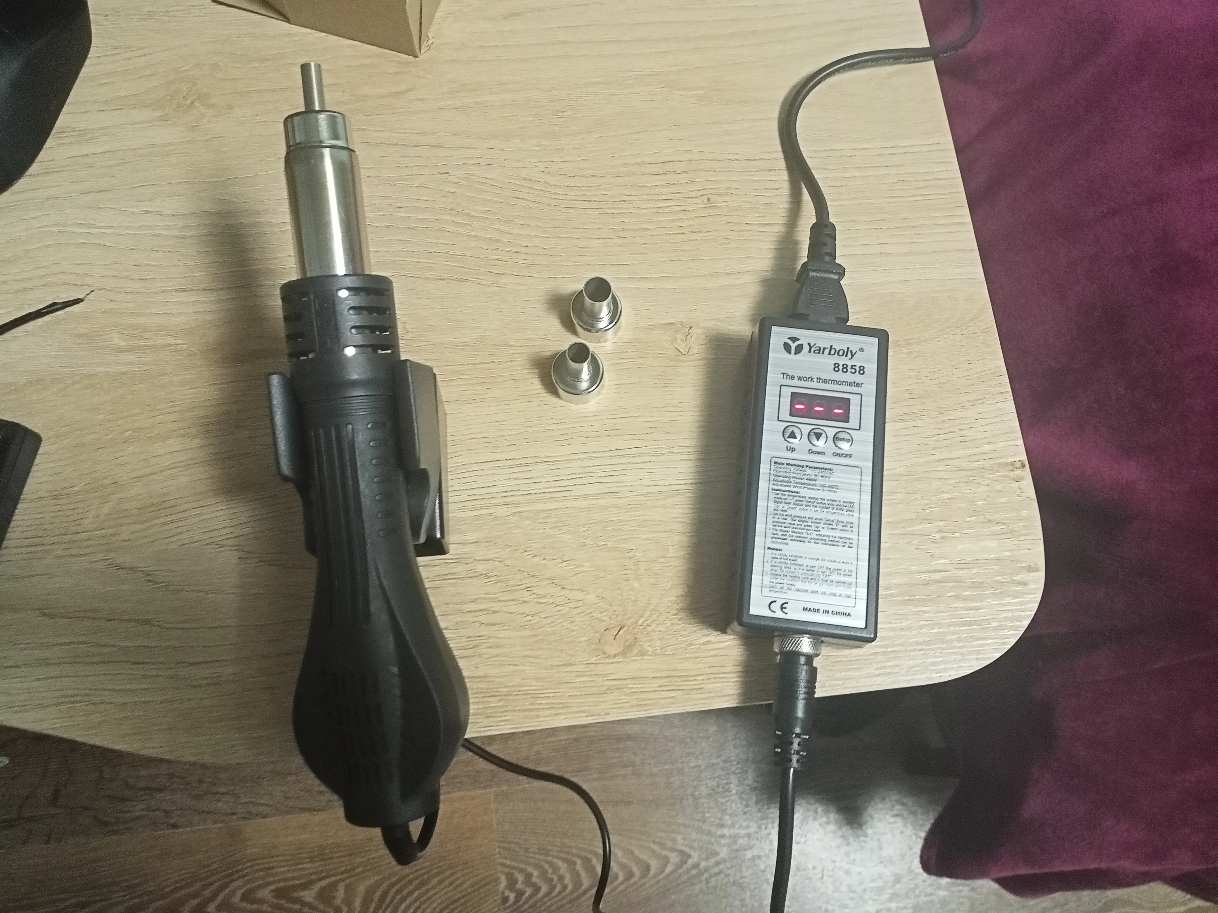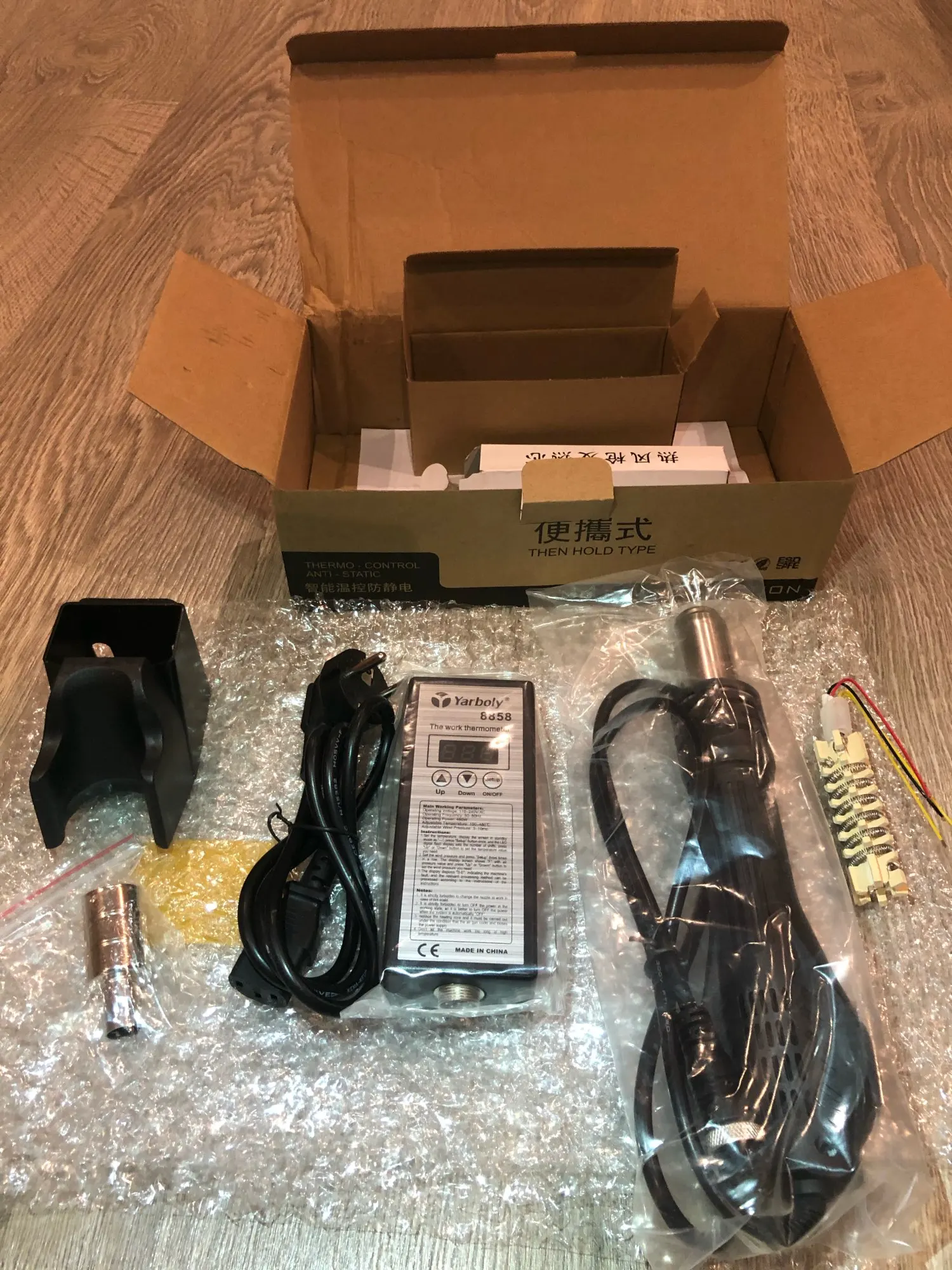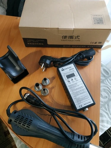 Пришло все в целости и сохранности. Работает, но как покажет себя в деле - посмотрим. Температура 100 - 450 (шаг один градус), мощность обдува - регулировка на 10 шагов. Режим ожидания при установке на подставку. Подставка в комплекте.