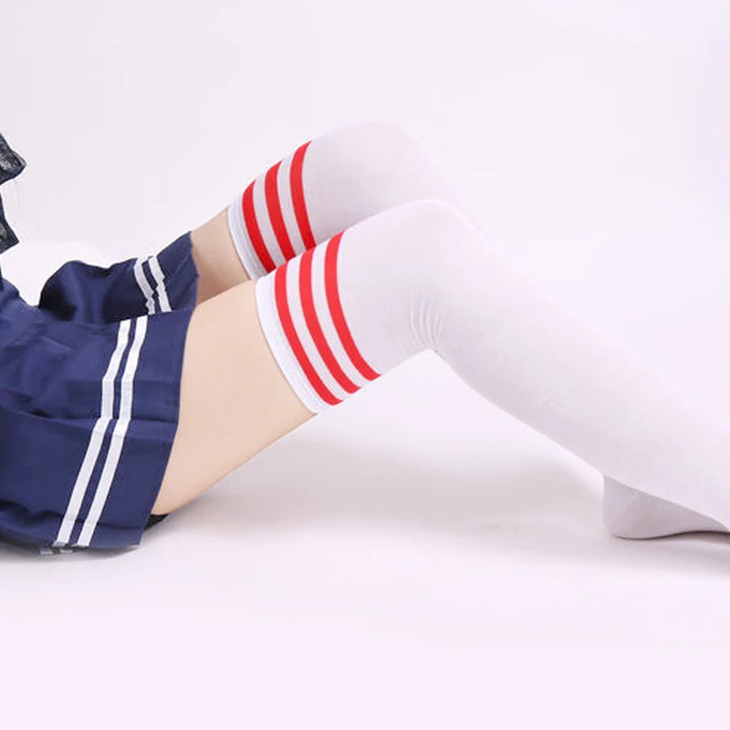 Женские длинные чулки выше колена, в черную и синюю полоску