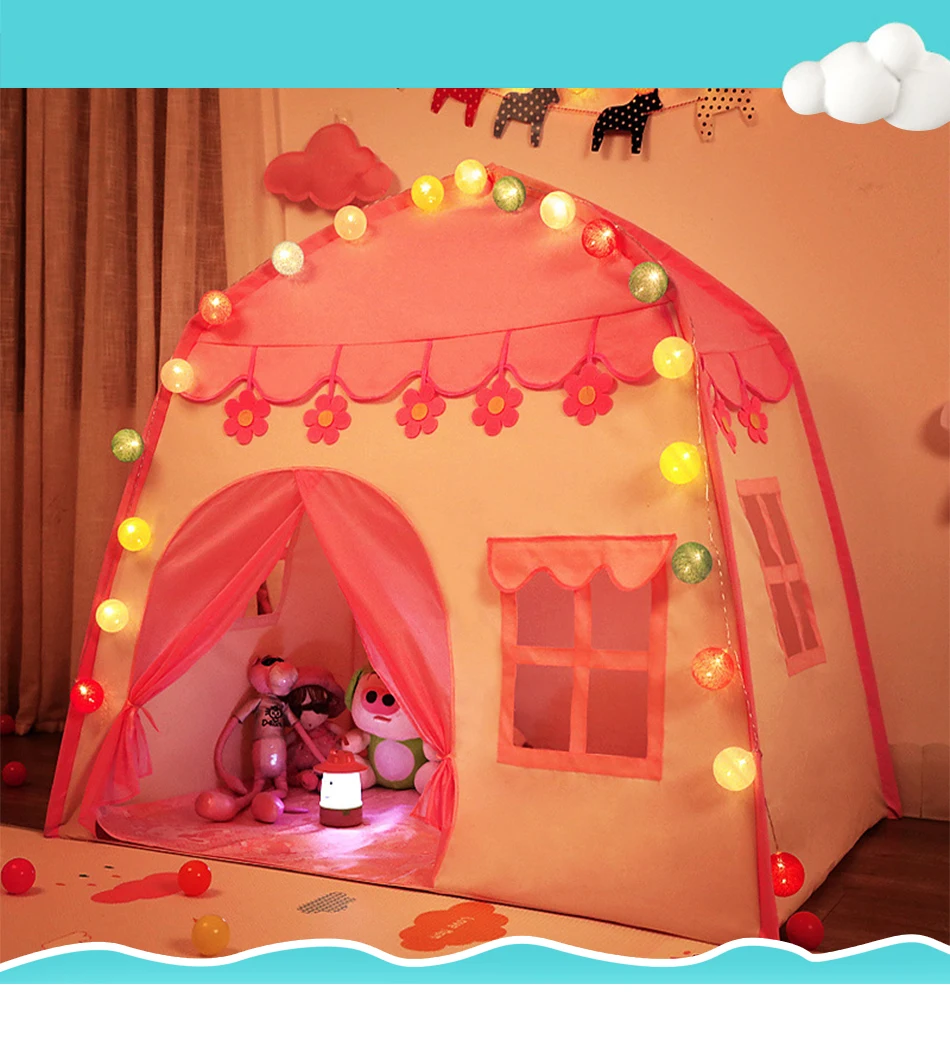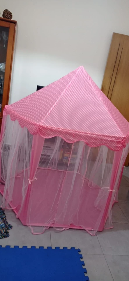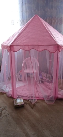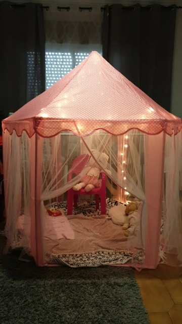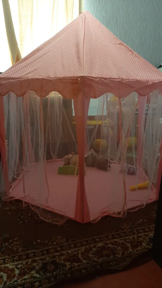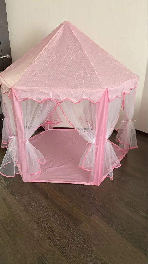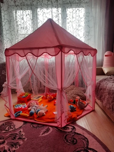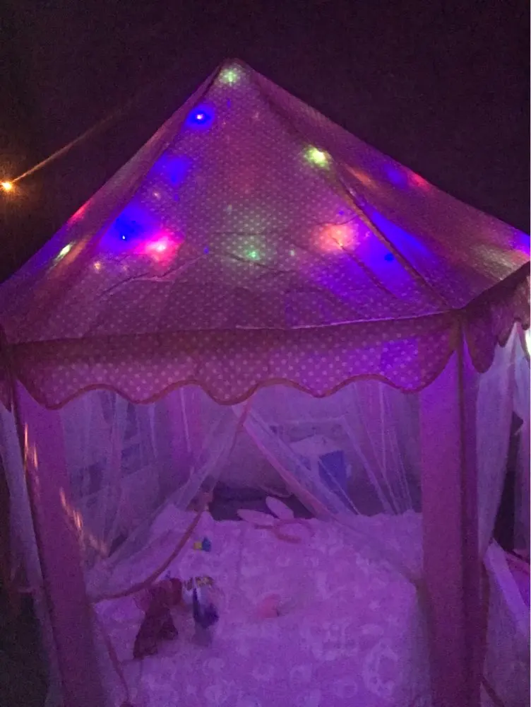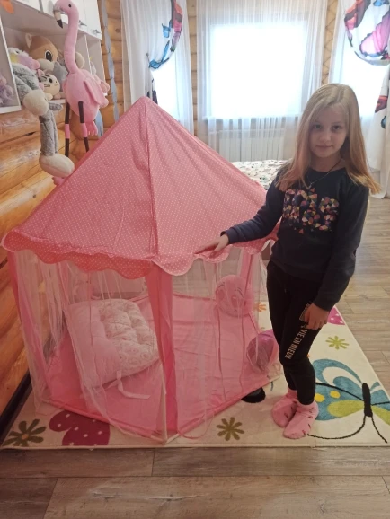 Потрясающая палатка всё как на картинке. Дочка 130 см встаёт в центре в полный рост. Сначала немного испугалась, что нехватка палочек потом сообразила одну лишнюю подрезать по размерам и получилось две недостающие. Я не знаю гирлянда шла ли в комплектации но нам положили. Гирлянда 5-7 метров (мерила руками), на батарейках, очень обрадовало безопасностью. Продавца однозначно рекомендую.