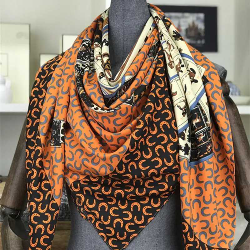 Классический Модный Шелковый шарф, женский большой квадратный шарф-полотенце с принтом лошадей, мягкая саржа, шелковая Всесезонная шаль, 130, подарок вечерние и путешествий