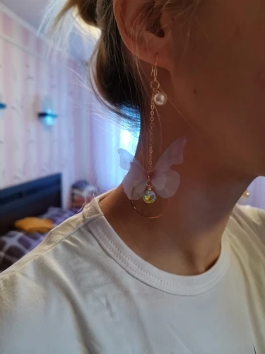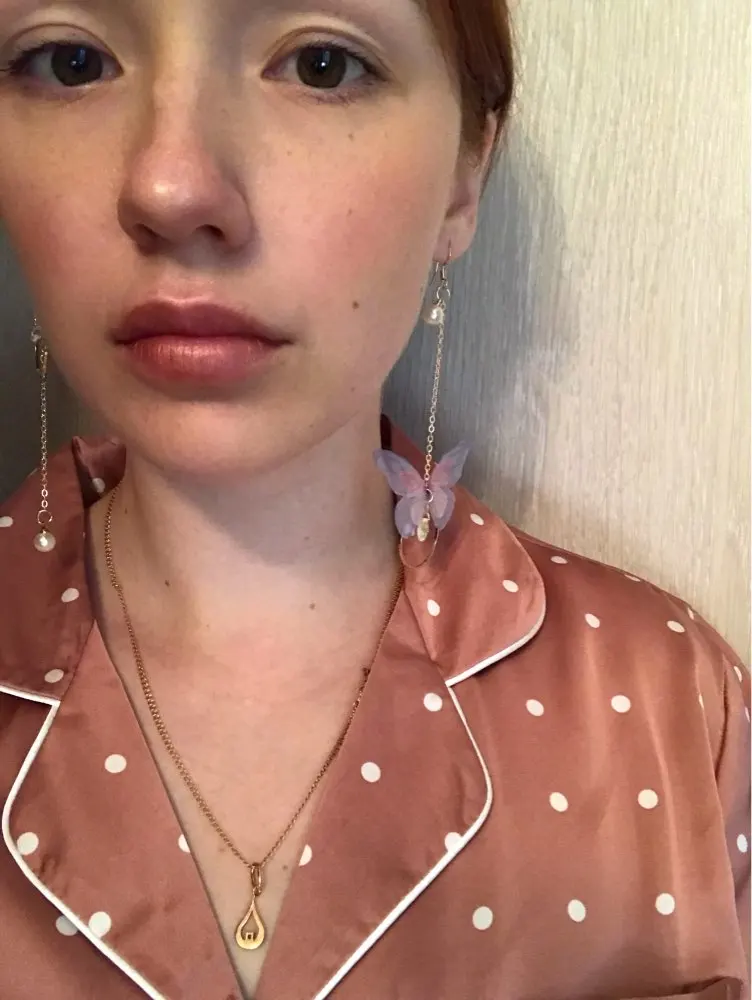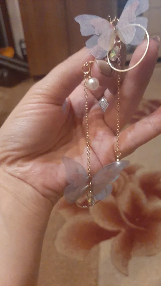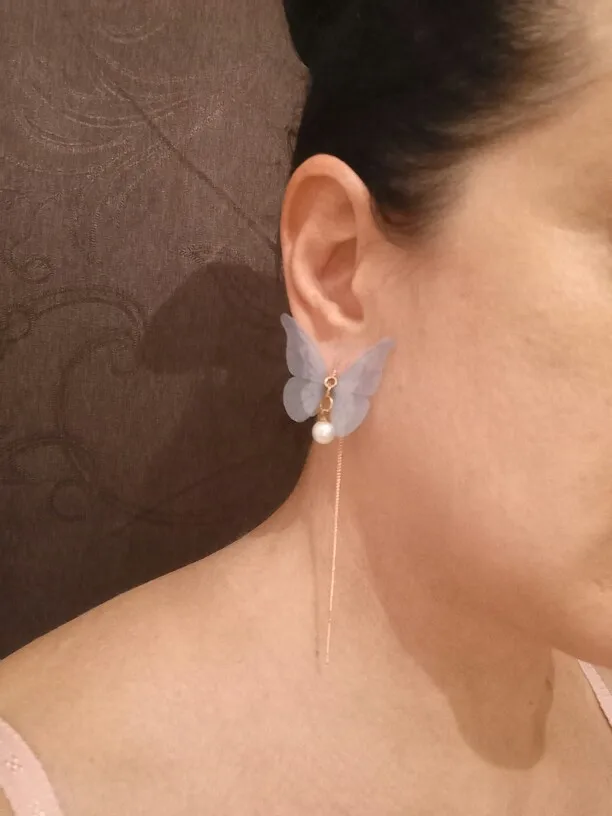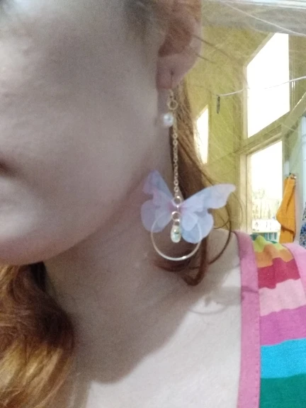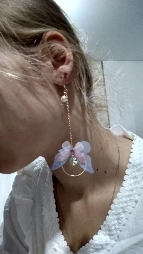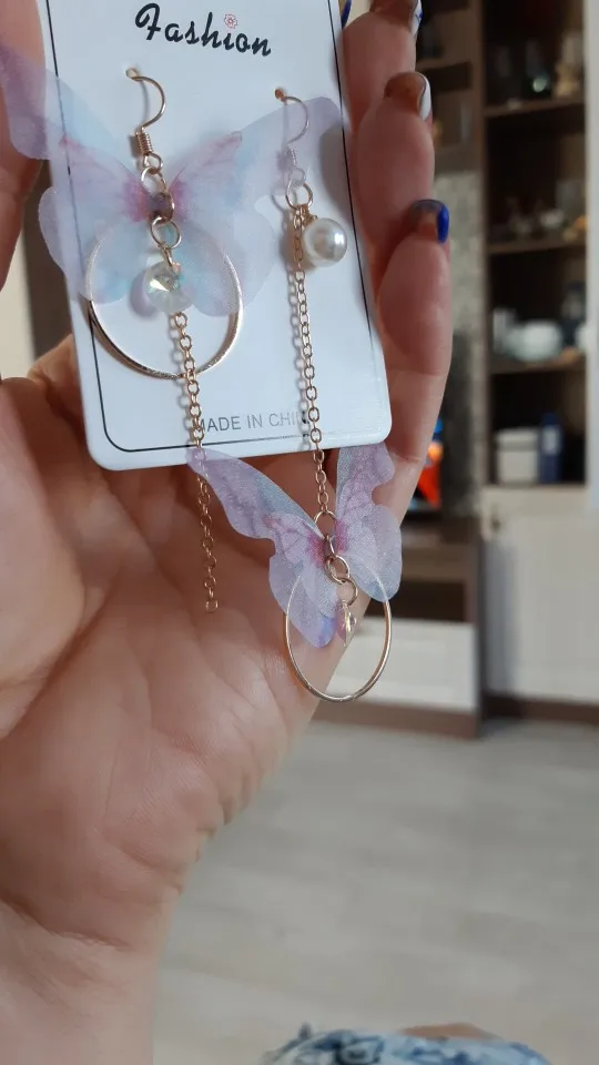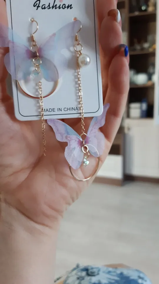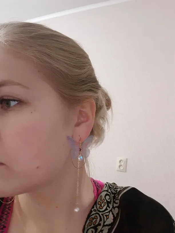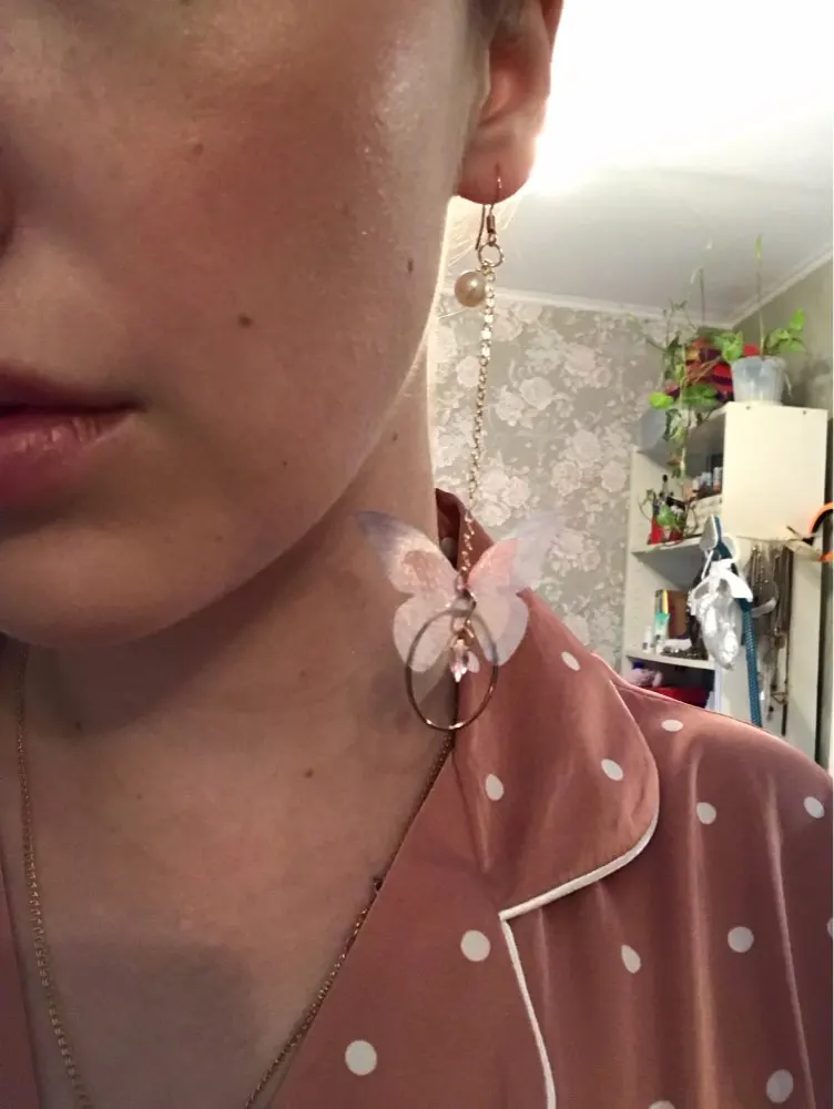 Очень красивые, нежные серьги) бабочки выполнены из ткани) К сожалению, когда открывала, случайно ножницами отрезала краешки у крылышек бабочек(( пришлось выходить из ситуации и ровнять(( так что форма у крылышек изначально была как на фото у продавца)