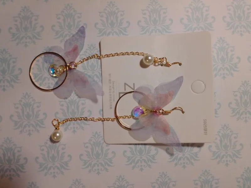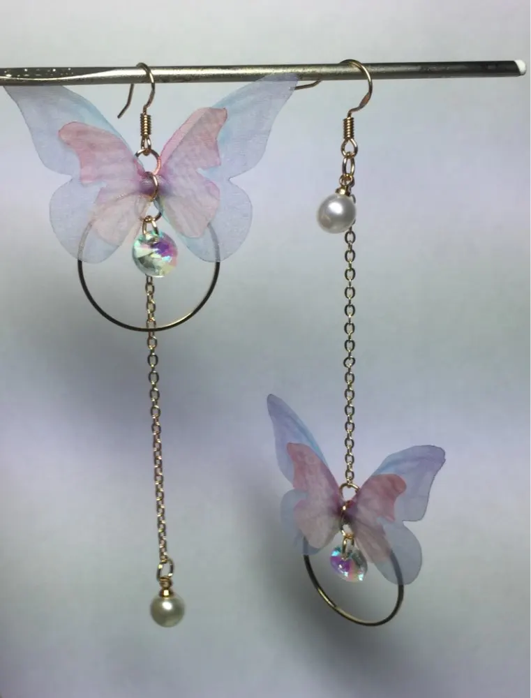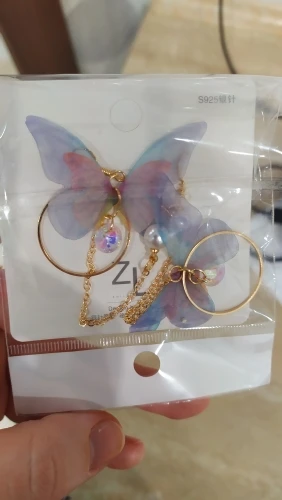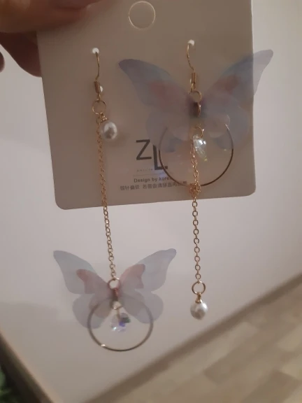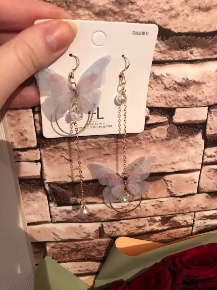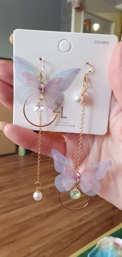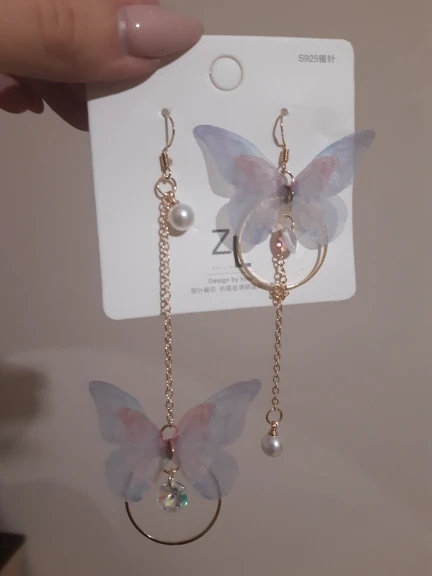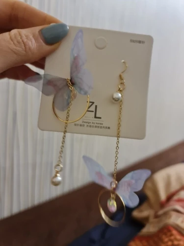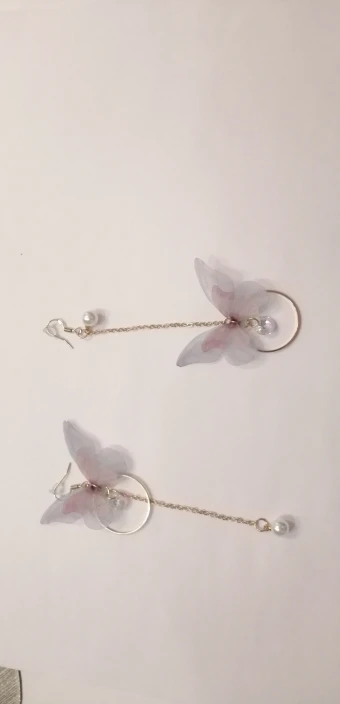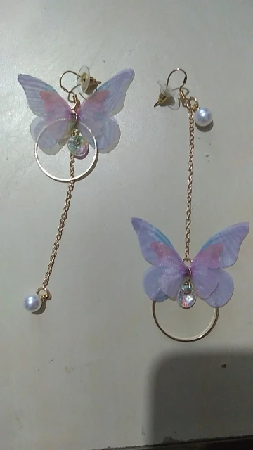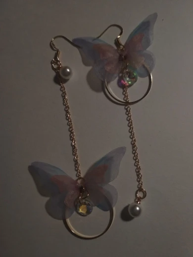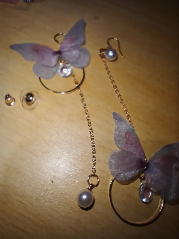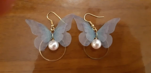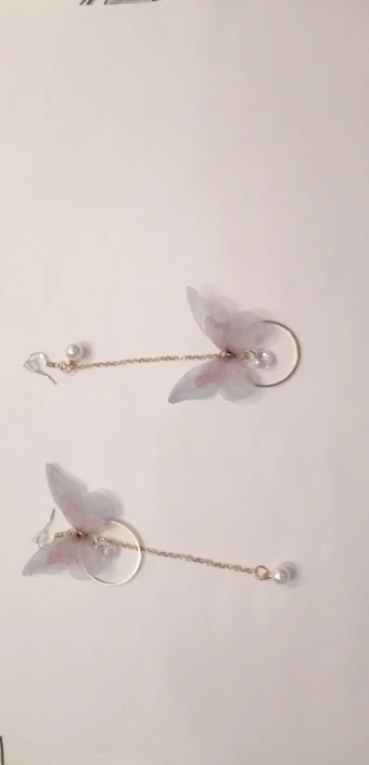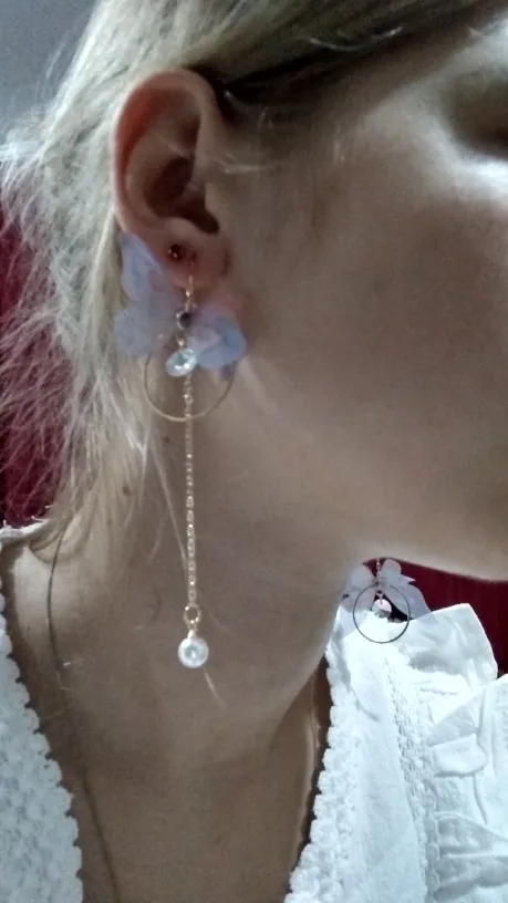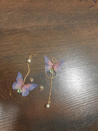Очень красивые, нежные серьги) бабочки выполнены из ткани) К сожалению, когда открывала, случайно ножницами отрезала краешки у крылышек бабочек(( пришлось выходить из ситуации и ровнять(( так что форма у крылышек изначально была как на фото у продавца)