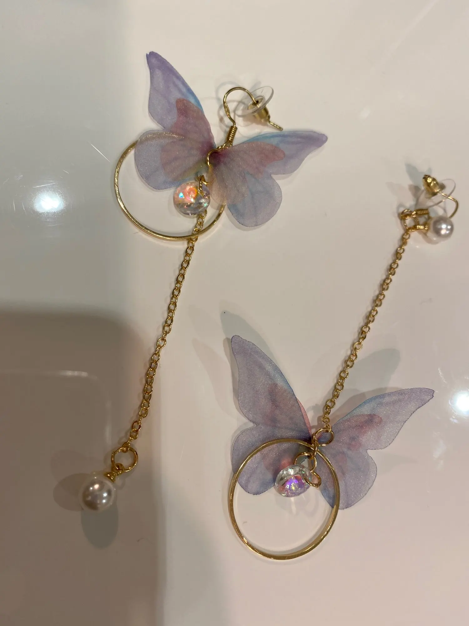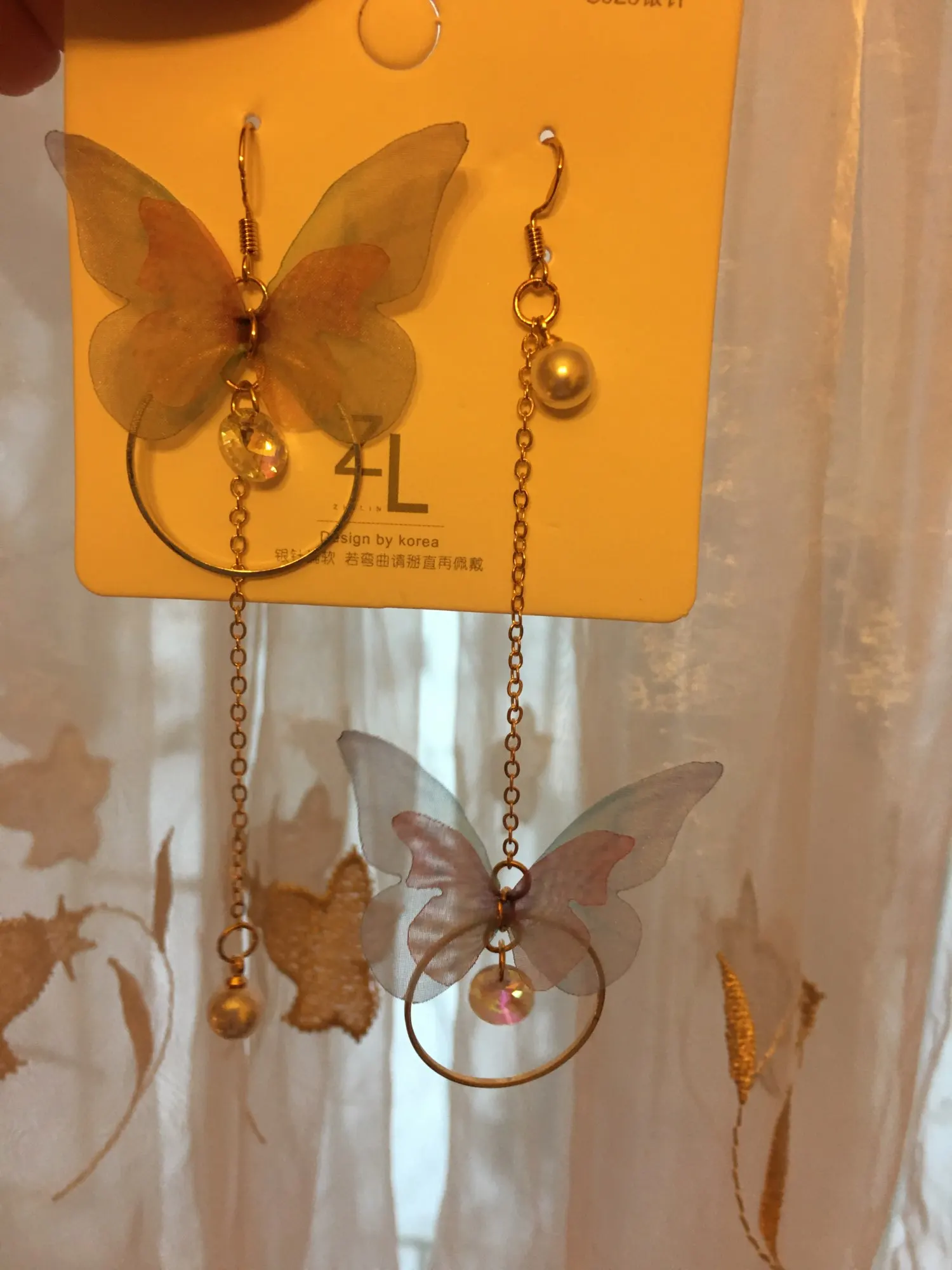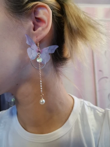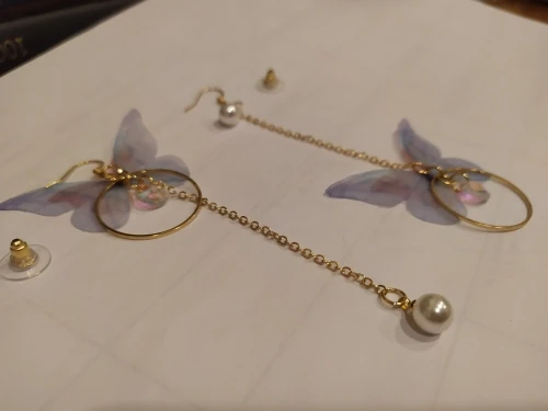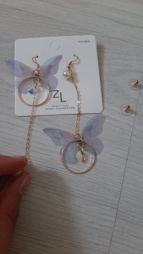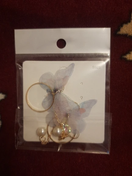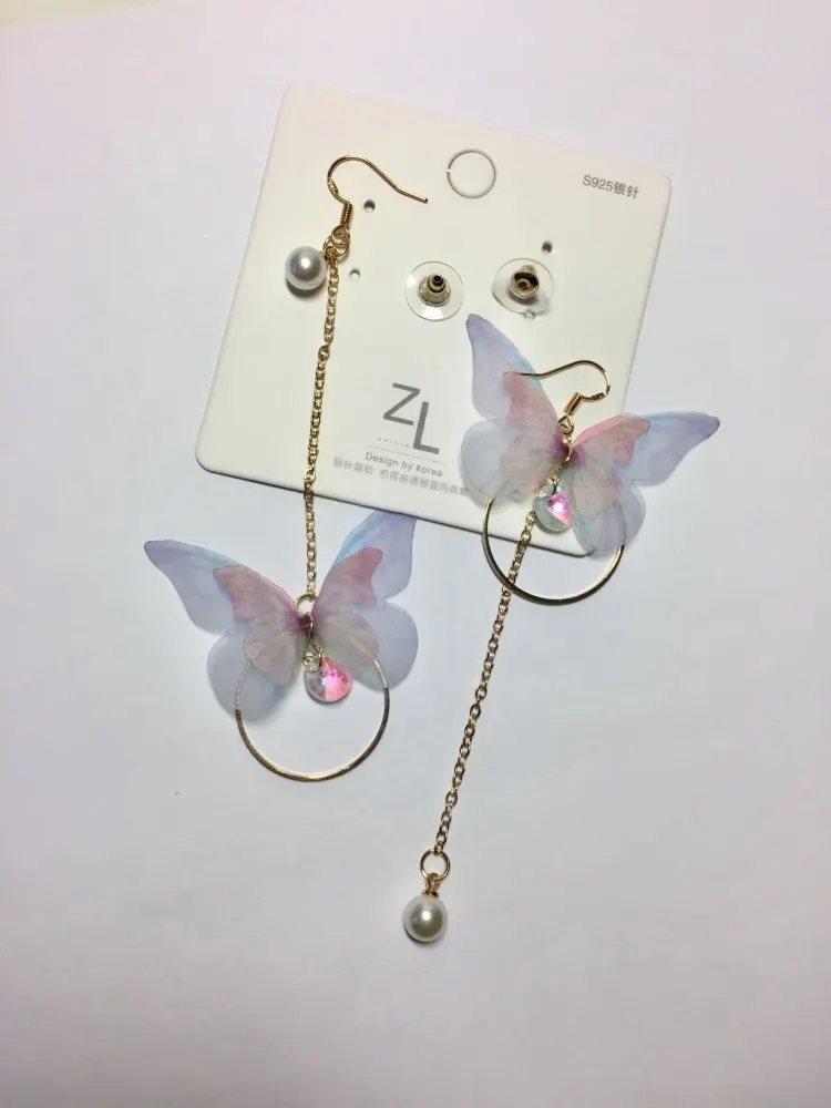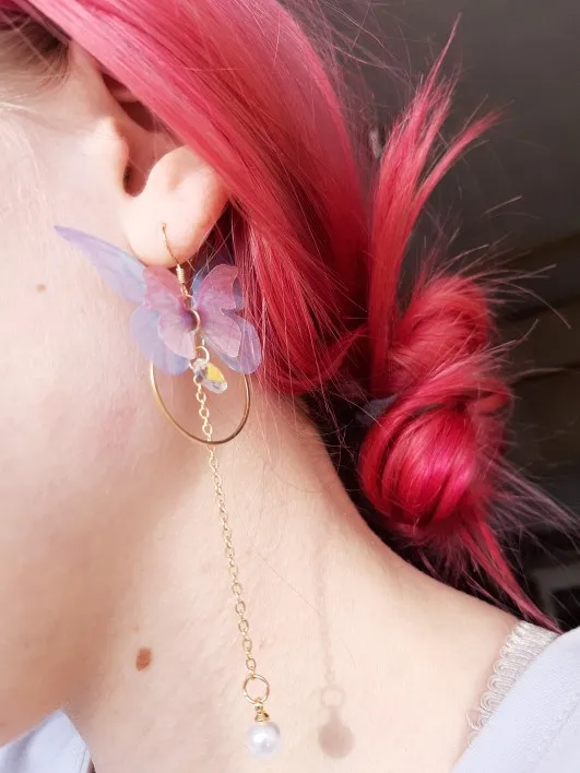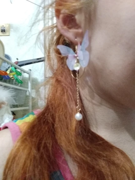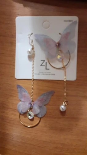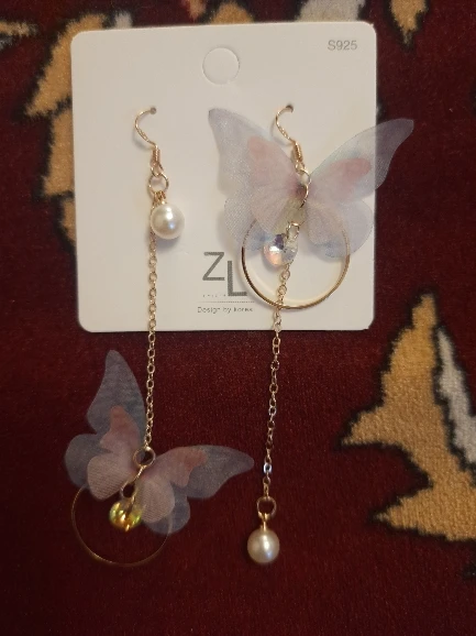 Очень красивые, нежные серьги) бабочки выполнены из ткани) К сожалению, когда открывала, случайно ножницами отрезала краешки у крылышек бабочек(( пришлось выходить из ситуации и ровнять(( так что форма у крылышек изначально была как на фото у продавца)