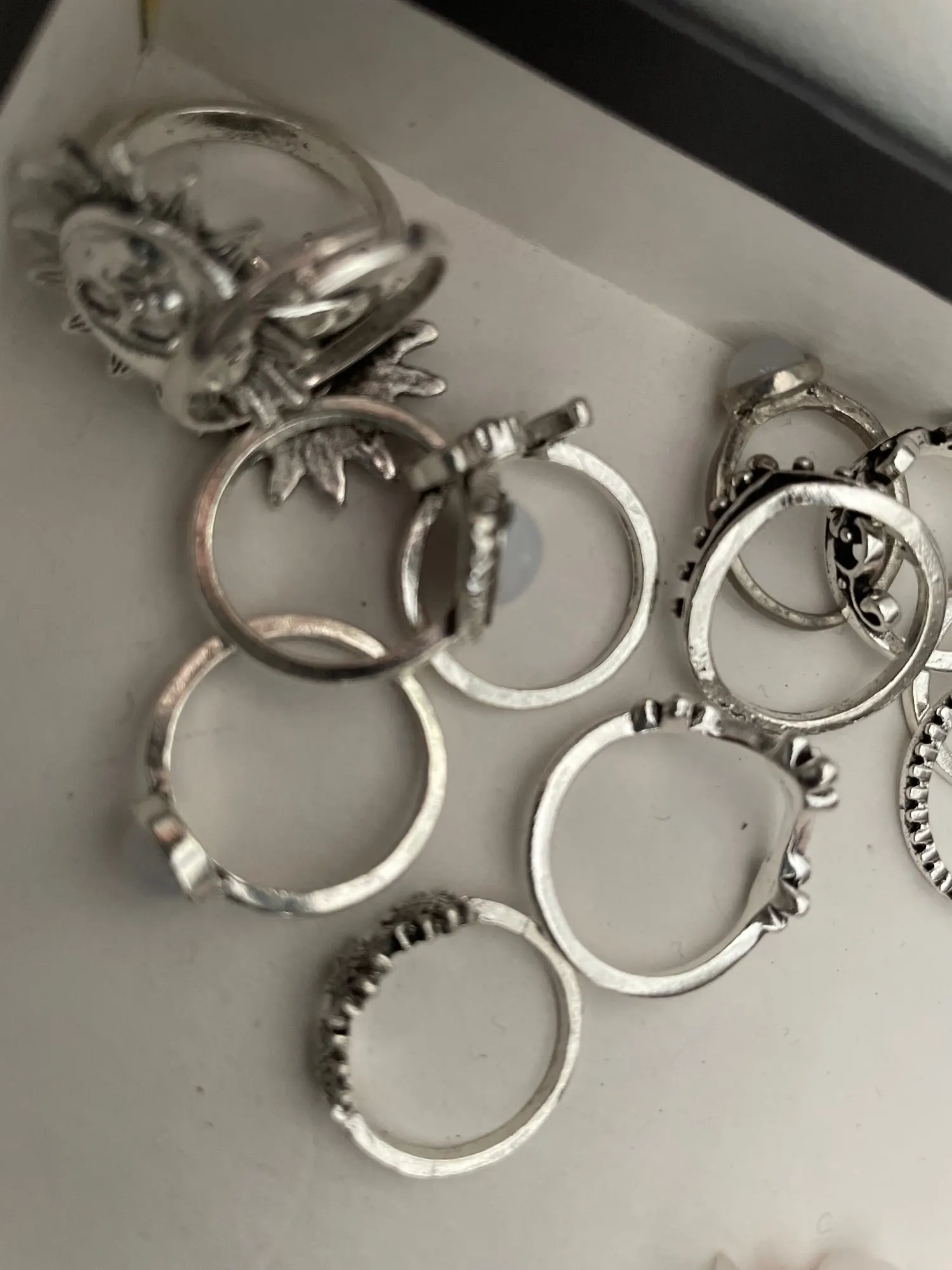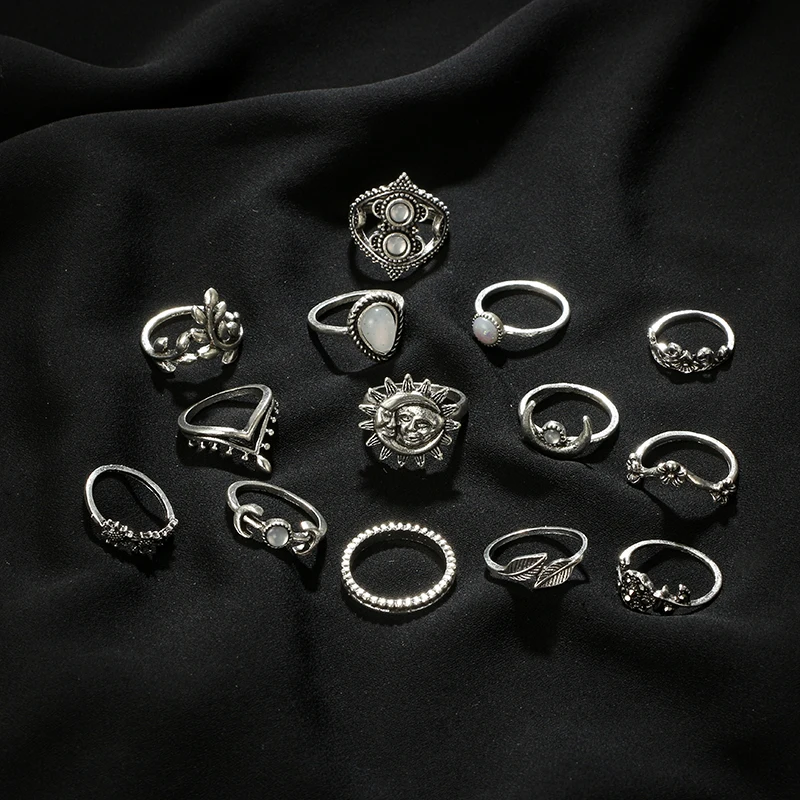 14 шт. винтажных серебряных колец huundai в форме Солнца и Луны для женщин, сплав, костяшки, цветы, кристаллы, искусственные кольца, ювелирные изделия 6226
