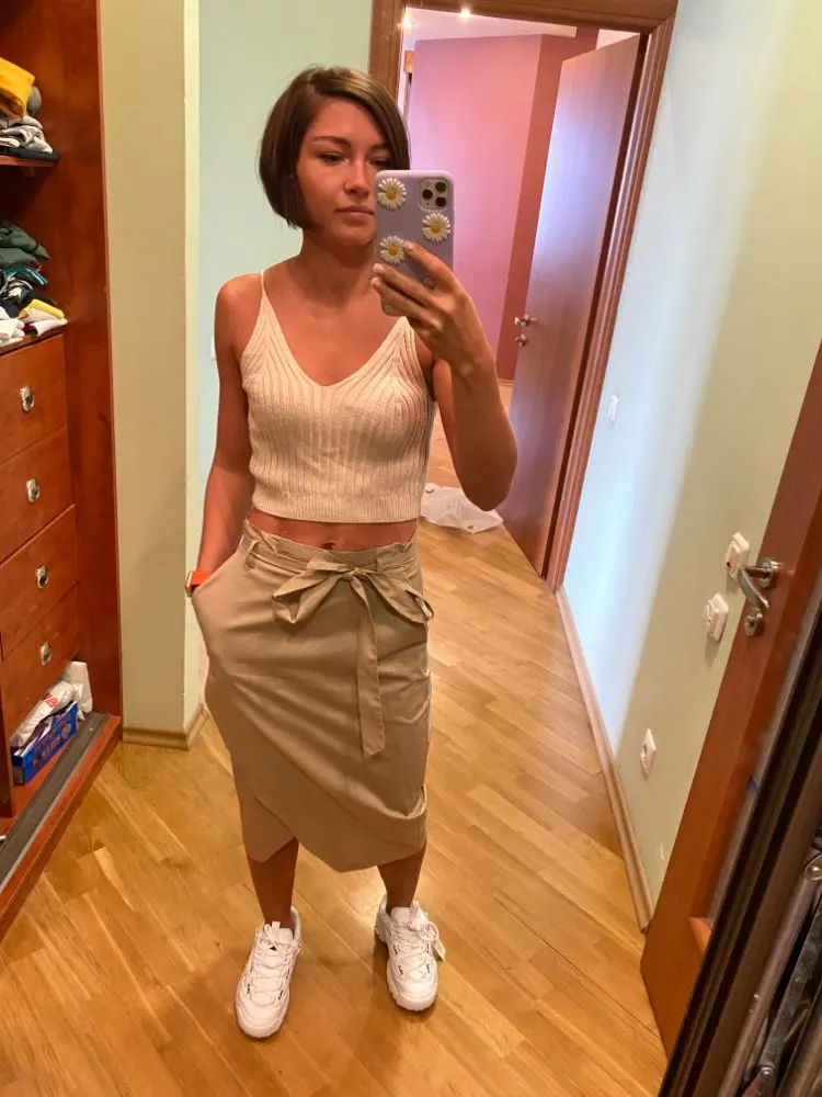 божественный топ, сидит отлично, ткань приятная, с белой футболкой- самое то❤️❤️ прибыл достаточно быстро, посылкой довольна))