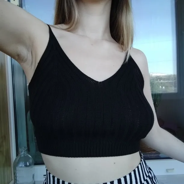 Сначала не знала с чем носить, поэтому пока такая вещь сугубо для домашнего образа. Качество отличное, кроме белой непонятной нити, которая как-то связана и не достаётся (на фото), за это и снимаю звездочку. А так удобный и красивый топ. До Москвы шло 17 дней