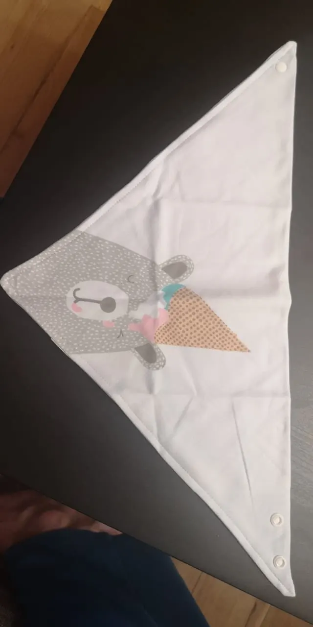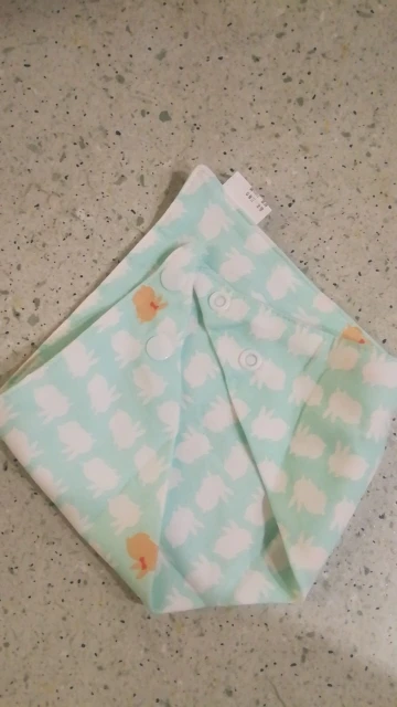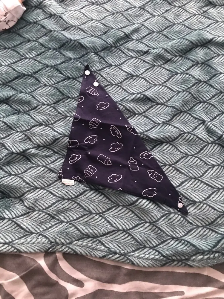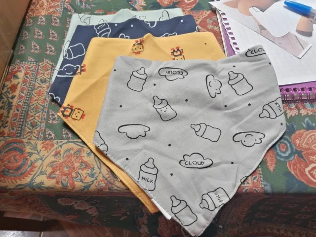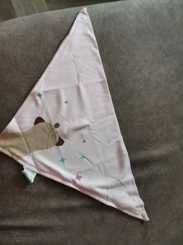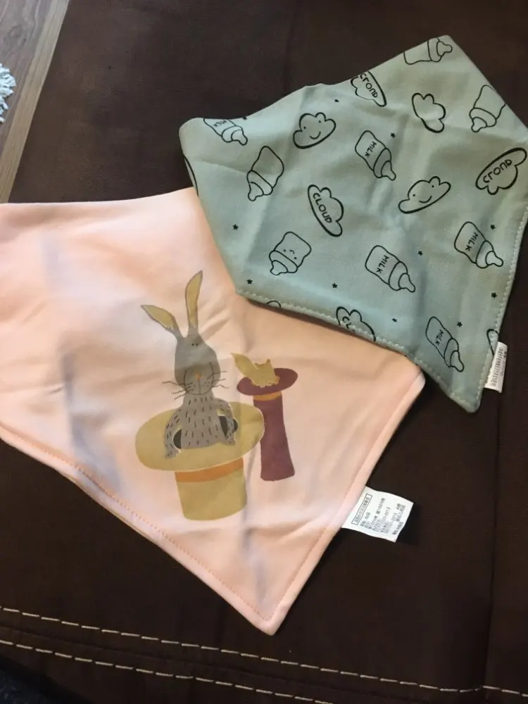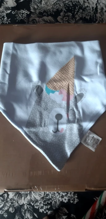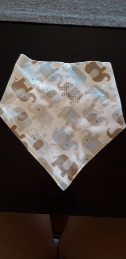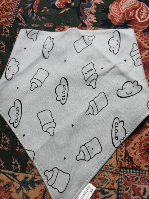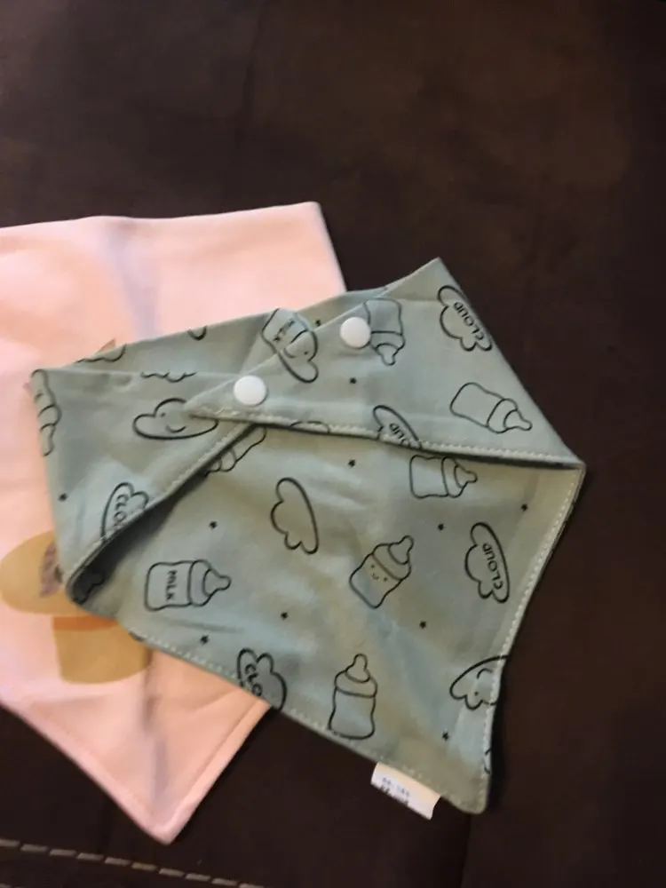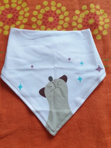 Красивый, мягкий, хлопковый слюнявчик, я заказала 3 штуки. Регулируется пластиковыми кнопками, из есть 2 для регуляции объёма шеи. Белые вживую имеют голубой оттенок, но это из не портит. Рисунок нанесен аккуратно, после стирки не отвалится. Шов аккуратный, ниток не торчит, запаха нет. Доставка около месяца, спасибо, все понравилось)