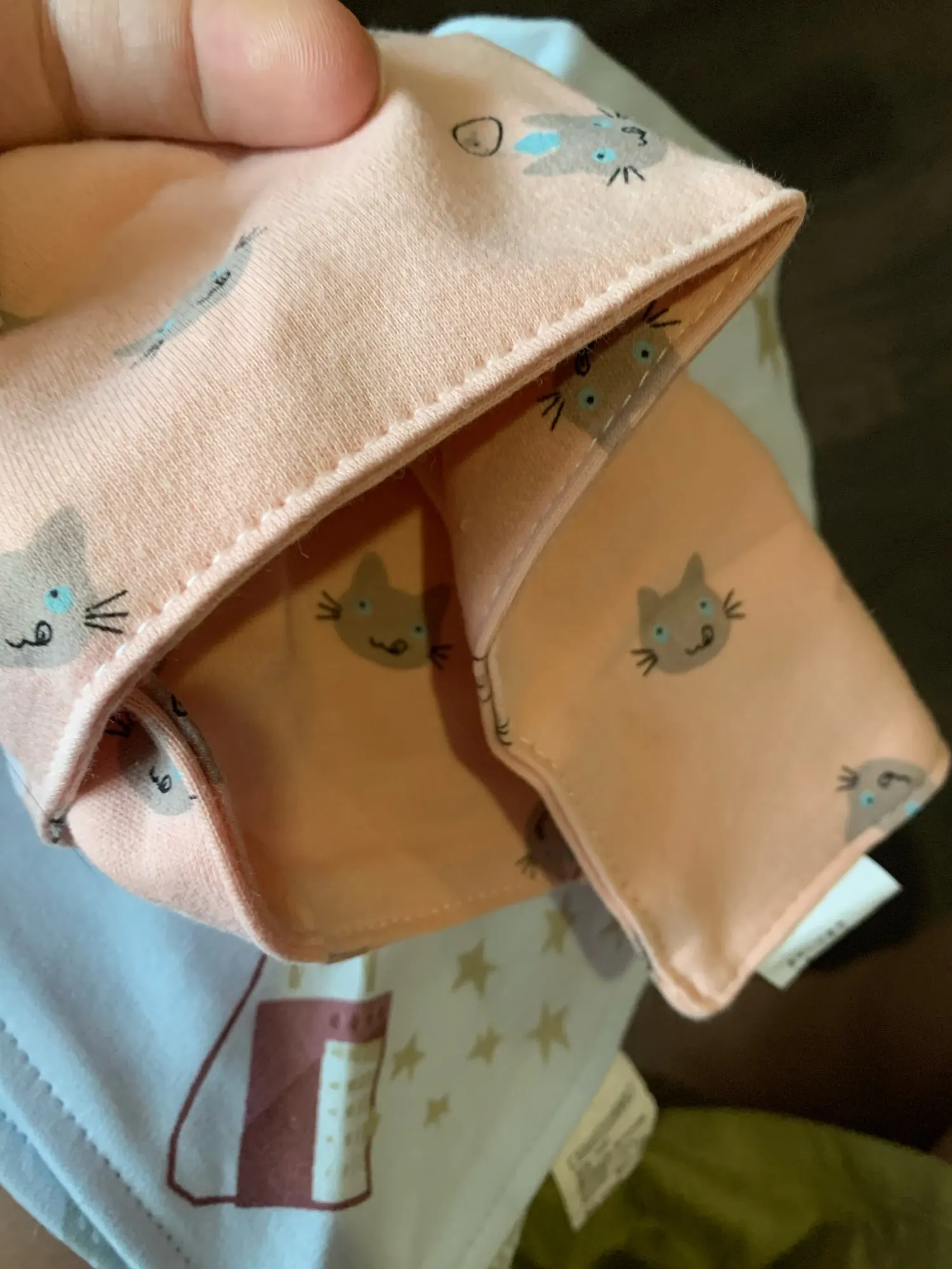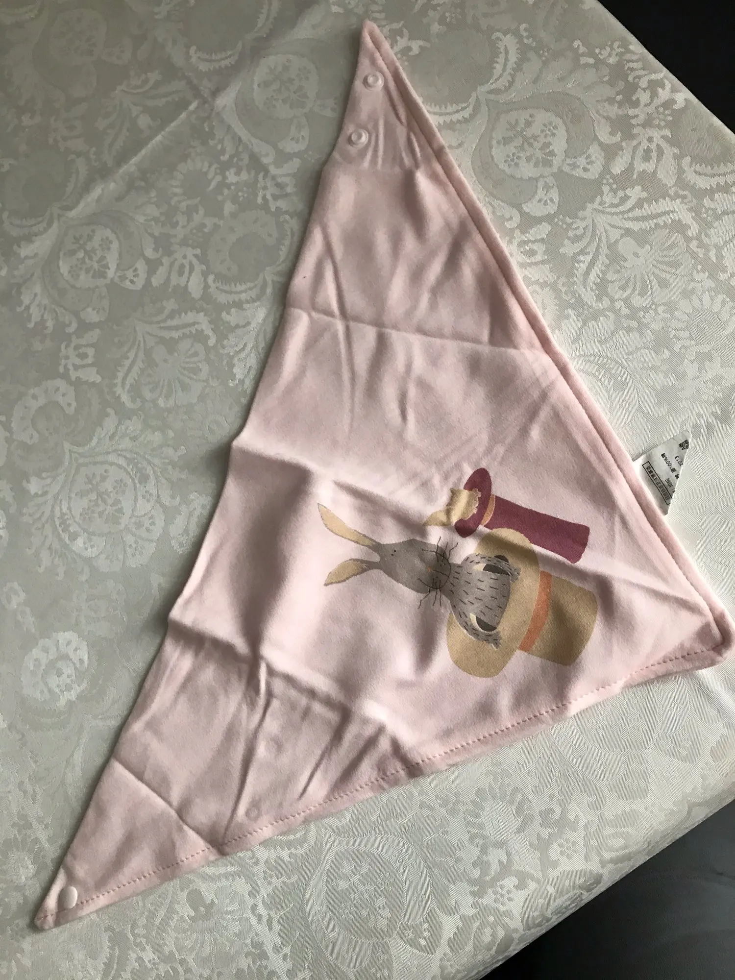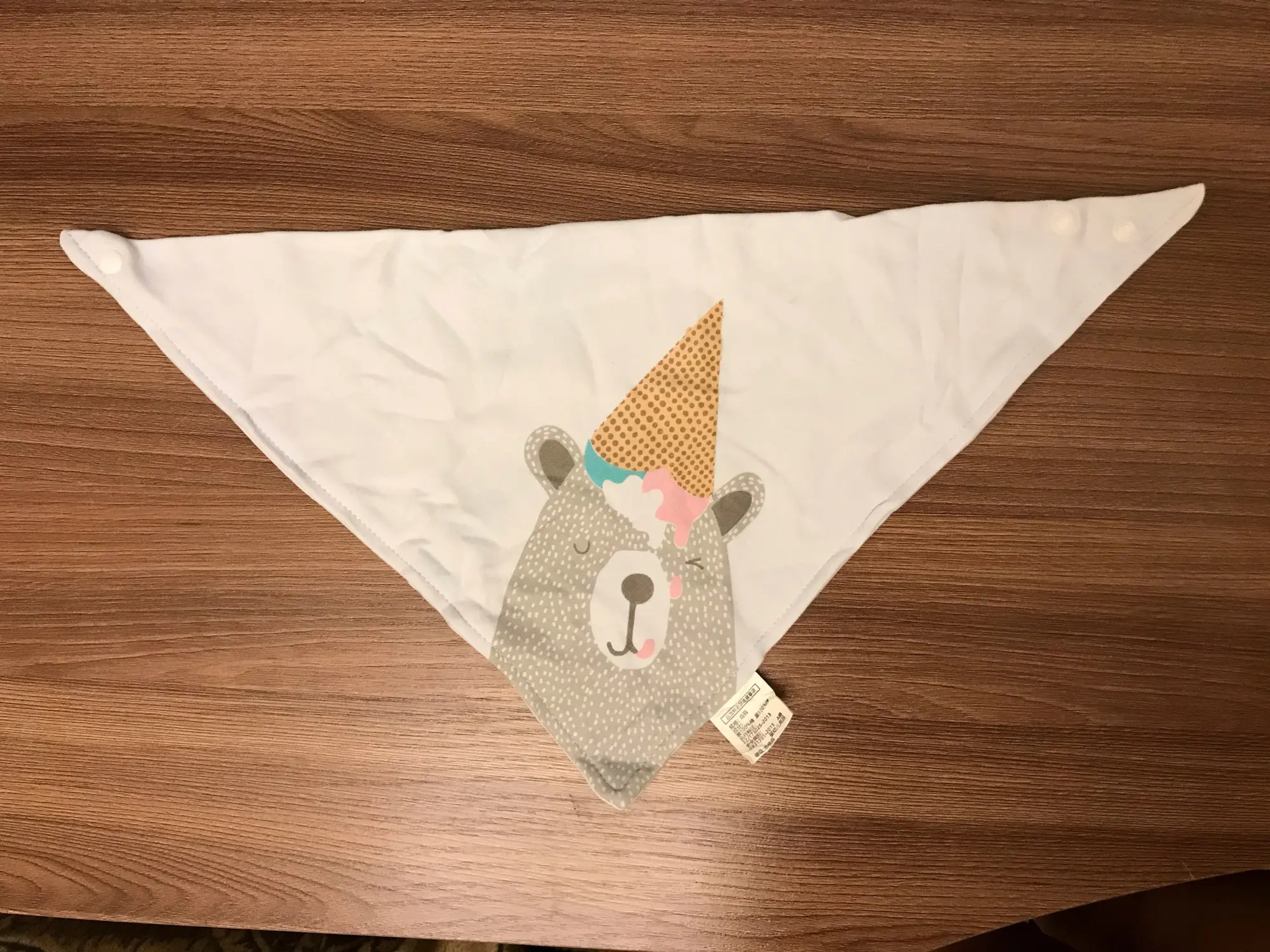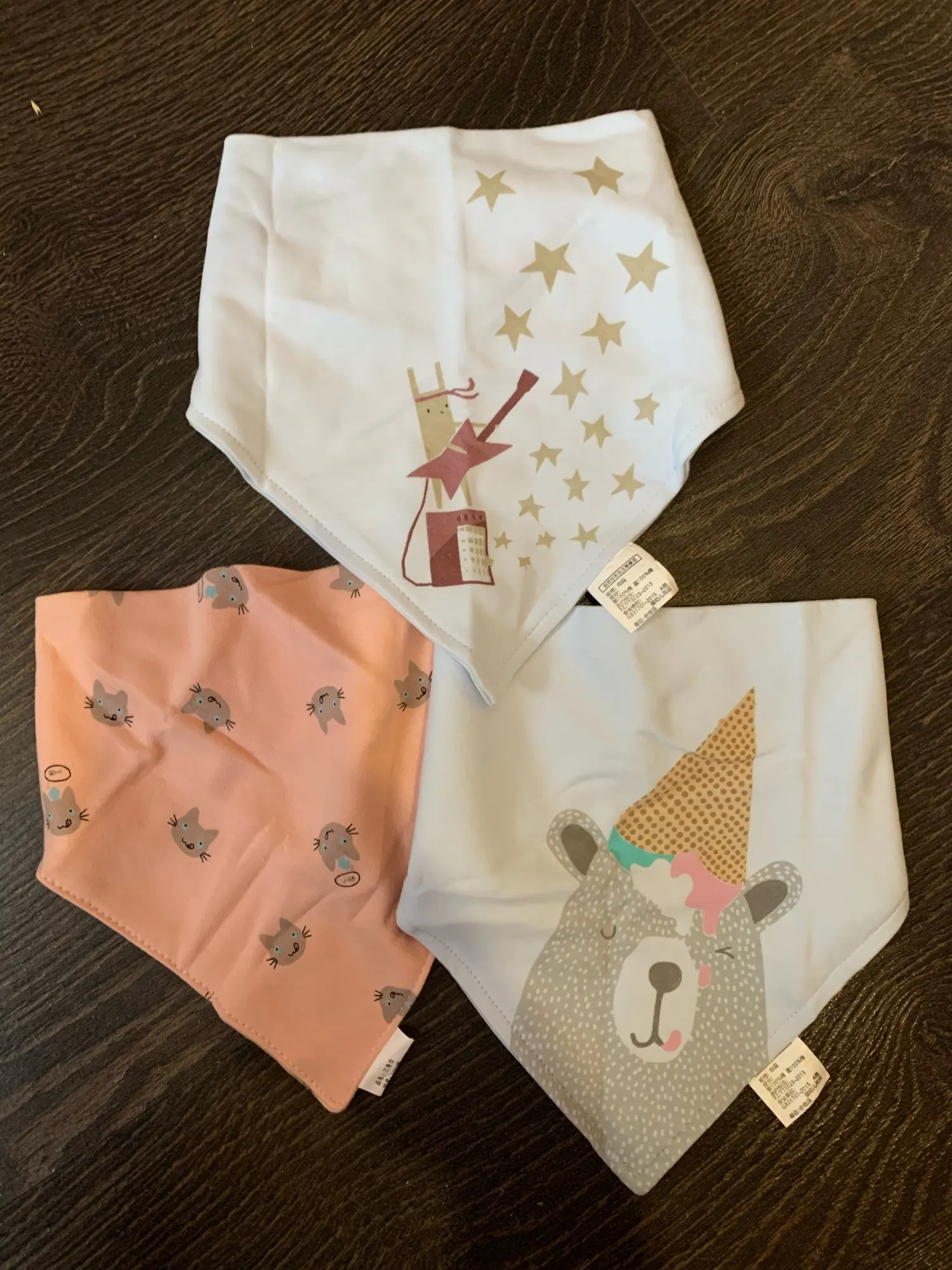 Красивый, мягкий, хлопковый слюнявчик, я заказала 3 штуки. Регулируется пластиковыми кнопками, из есть 2 для регуляции объёма шеи. Белые вживую имеют голубой оттенок, но это из не портит. Рисунок нанесен аккуратно, после стирки не отвалится. Шов аккуратный, ниток не торчит, запаха нет. Доставка около месяца, спасибо, все понравилось)