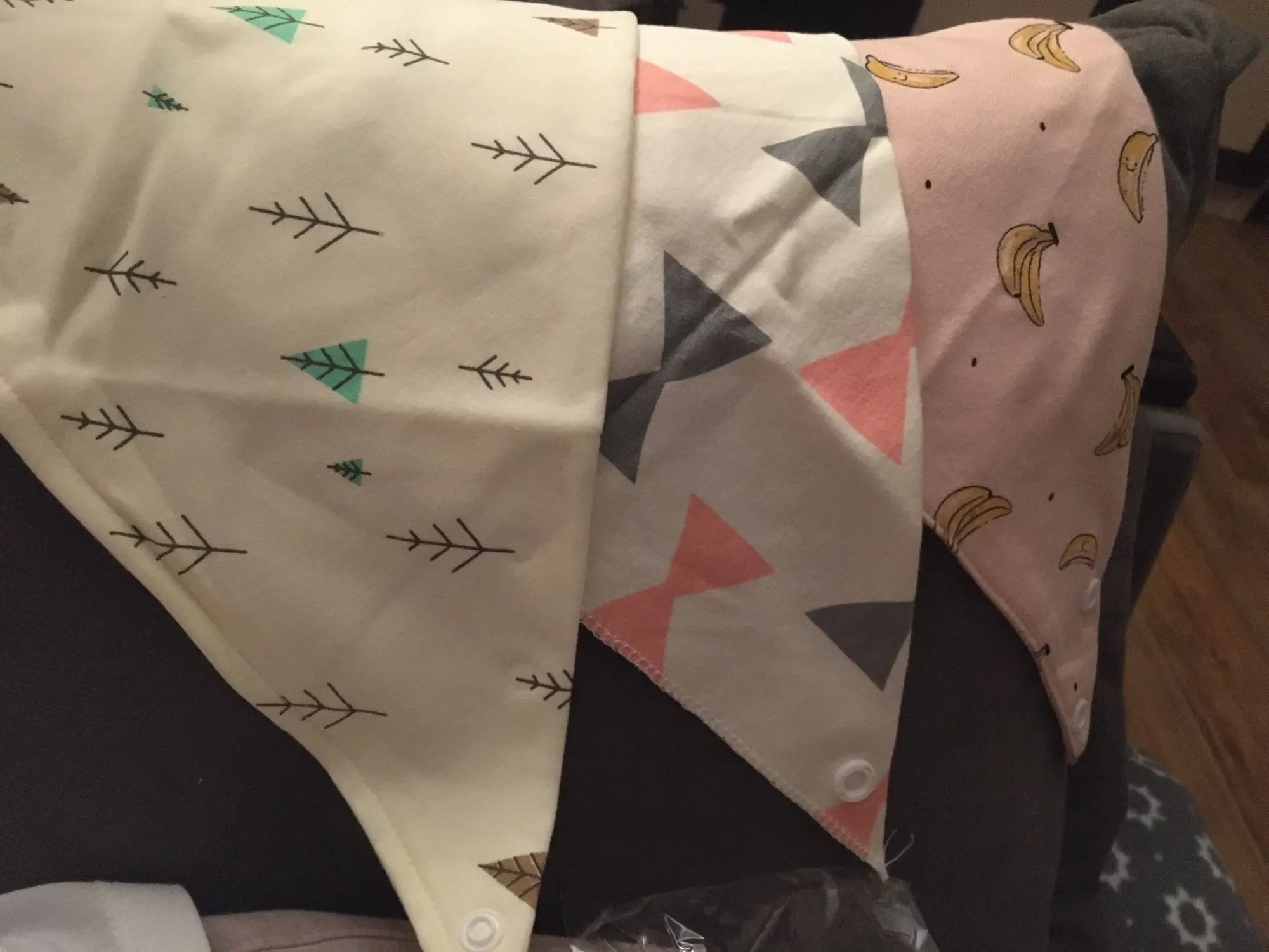 Нагрудниками осталась очень довольна ,сделаны из хлопка ,достаточно плотные ,сзади два уровня крепления ,можно сделать немного свободнее либо более плотно закрепить на малыше (совершенно не давит)Пробовали в эксплуатации ,больше не требуется платок что бы вытирать слюни ребёнку ,так как нагрудник плотный ,он длительное время не становится на сквозь мокрым .С сердечками нагрудник чуть меньше по размерам по сравнению с двумя другими ,но он так же отлично подошёл ребёнку (9 кг) .До Краснодара доставка заняла 2 недели .
