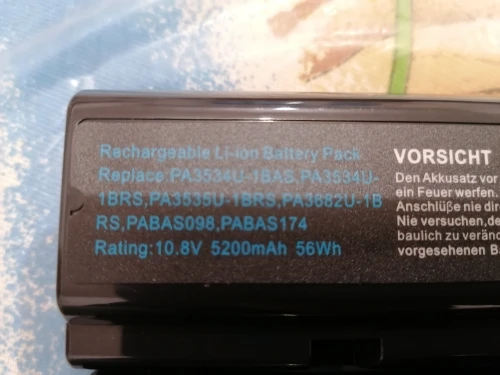 Аккумулятор получил, вопросов к самому блоку и упаковке нет. Все хорошо установилось в ноут toshiba satellite a300, зарядки было на 69%. Буду теперь разряжать-заряжать, надеюсь ёмкость будет держать. На этом плюсы закончились. И самое ужасное, доставка 65 дней с кривым отслеживанием. Оплатил 25.11., продавец отправил 3.12., на мою почту пришло 1.02.2021. В ноутбук как видите вставил 04.02.2021.