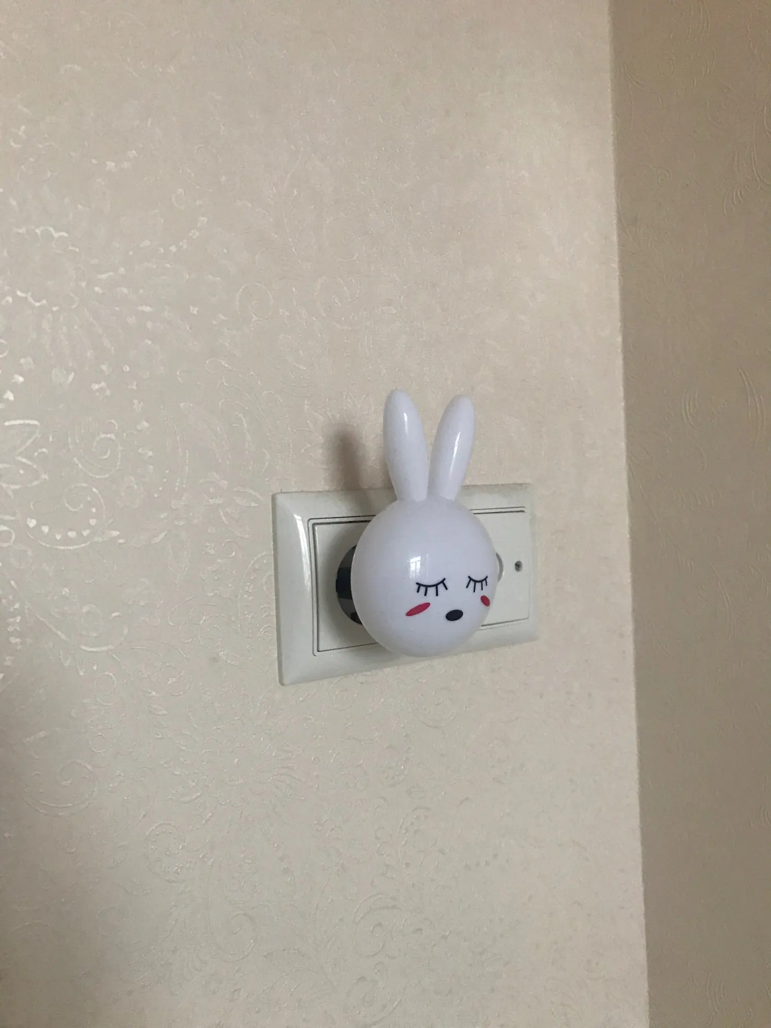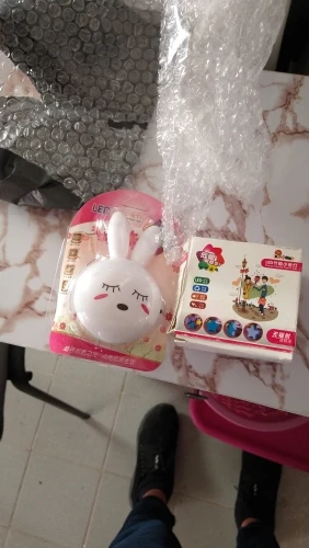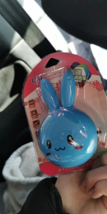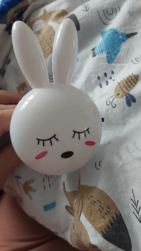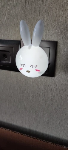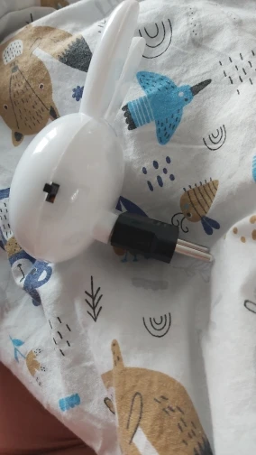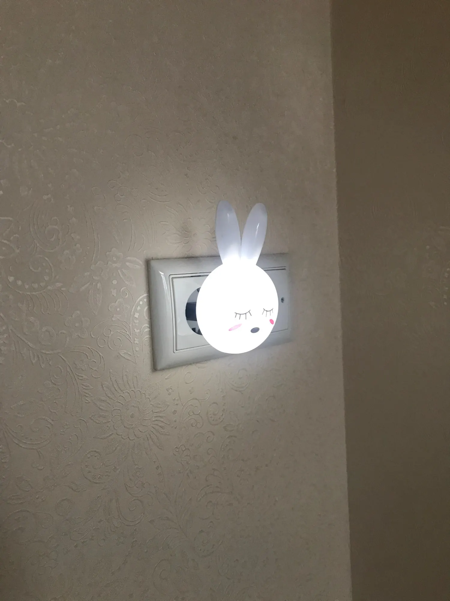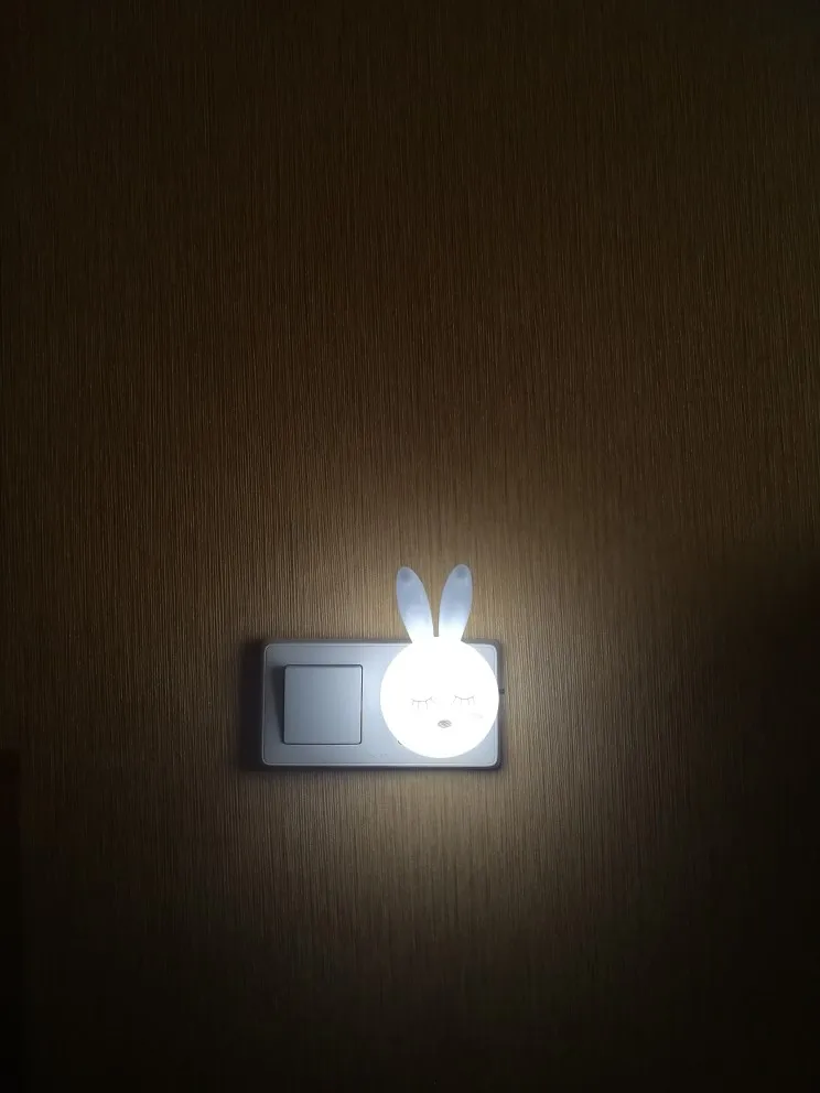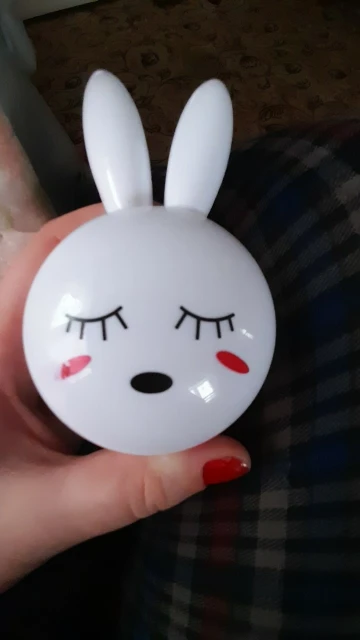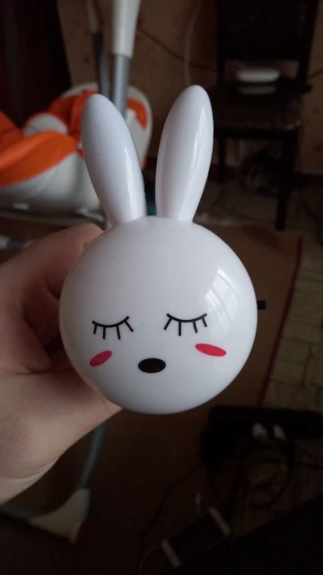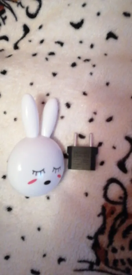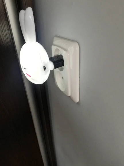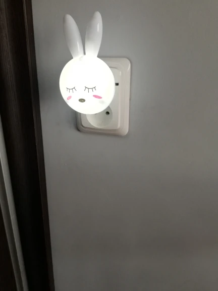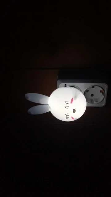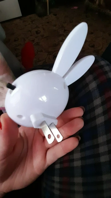 Посылка шла 3 недели. Светит ярко. Переходник пришел расшатанный ( в разетке не держался). Муж раскрутил и подлатал) За такие деньги впринципе не плохо) А ребенок главное доволен) Размер небольшой, не считая ушек, заяц будет размером на один разъем разетки.