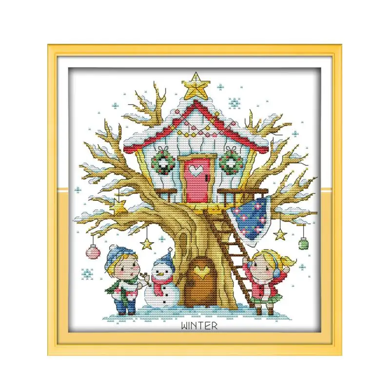 Набор для вышивки крестиком Tree House (зима), Набор для вышивки крестиком aida 14ct 11ct, детская вышивка, рукоделие сделай сам