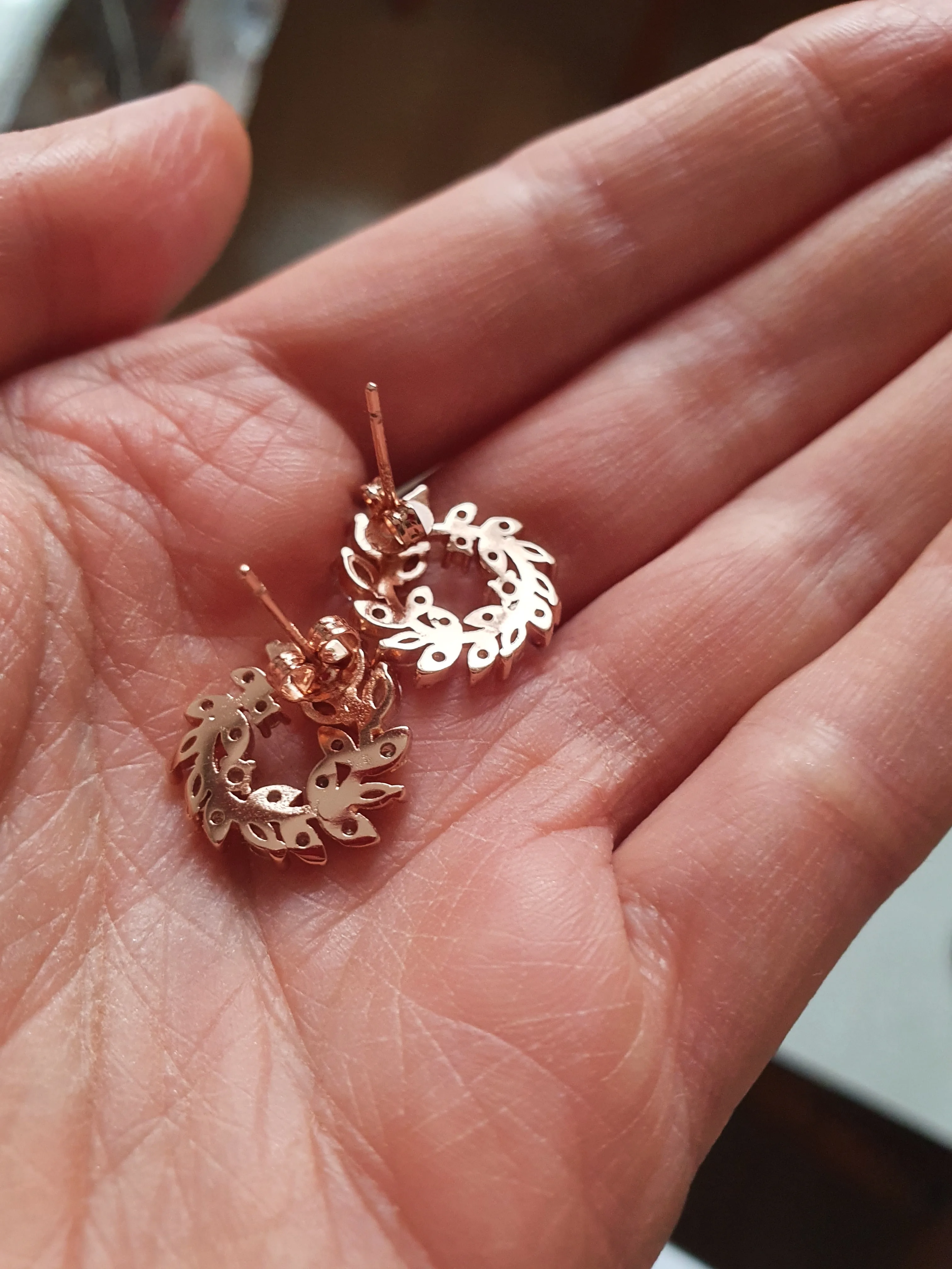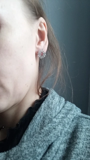 очень красивые серьги, блестят потрясающе, прямо очень! они не особо большие, выглядят на ушах мило. одна сережка чуть-чуть кривовата, но это при носке незаметно, так что за это оценку не снижаю