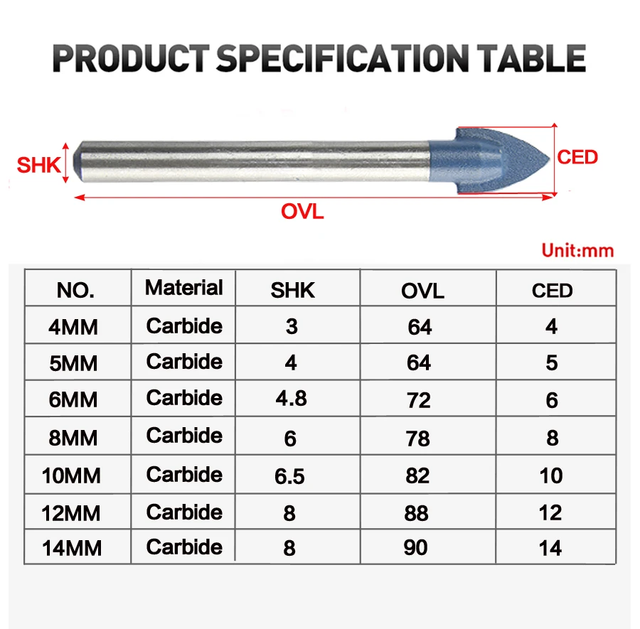 Набор сверл с алмазным наконечником для стеклянной плитки, карбид вольфрама, наконечник для копья, керамическая плитка, мраморное зеркальное сверло