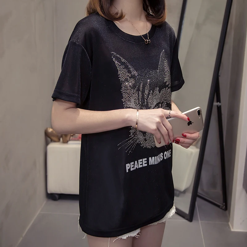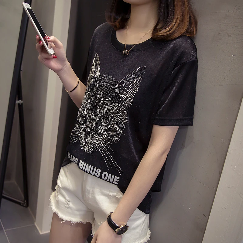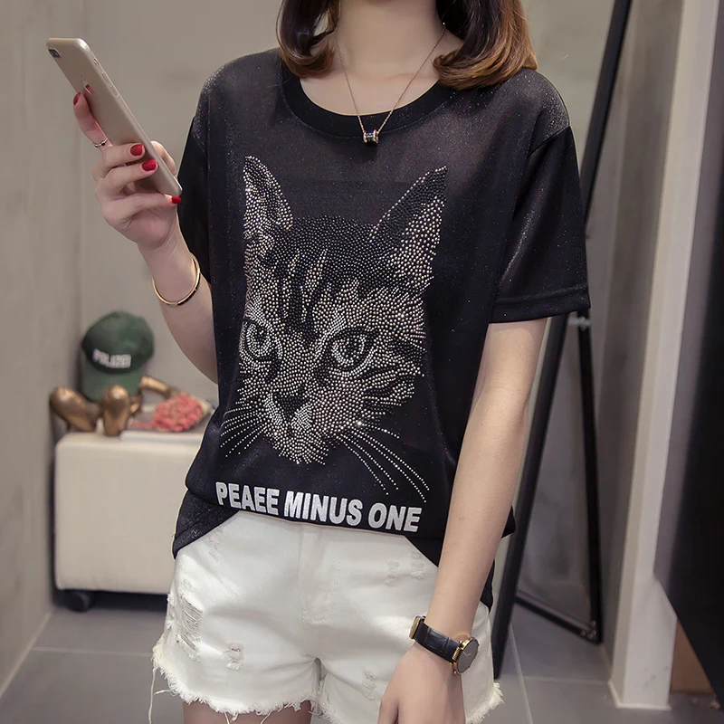 Модные топы с рисунком кошки, шелковая футболка с горячими бриллиантами, футболка с короткими рукавами, женская летняя новинка 2021 года, свободные удобные футболки в корейском стиле, женские