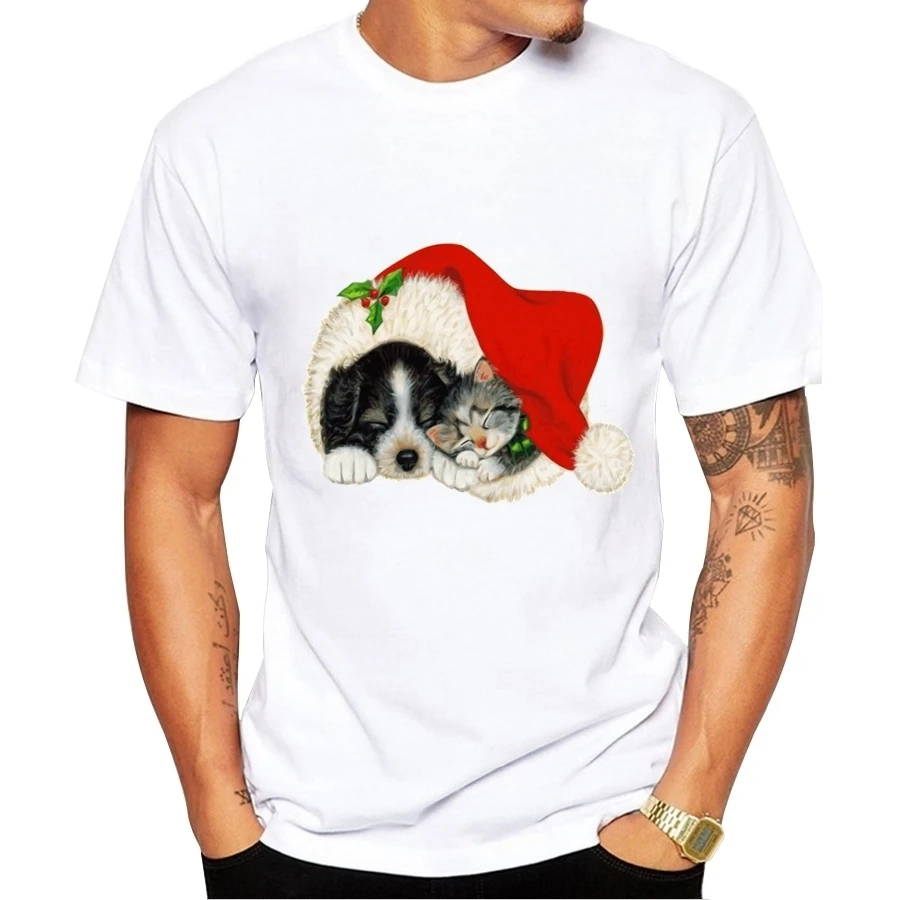 2019 забавная футболка с рождественской шапочкой и собакойкошкой, мужская летняя крутая футболка с принтом, рождественские топы, футболки, мужская футболка gt175