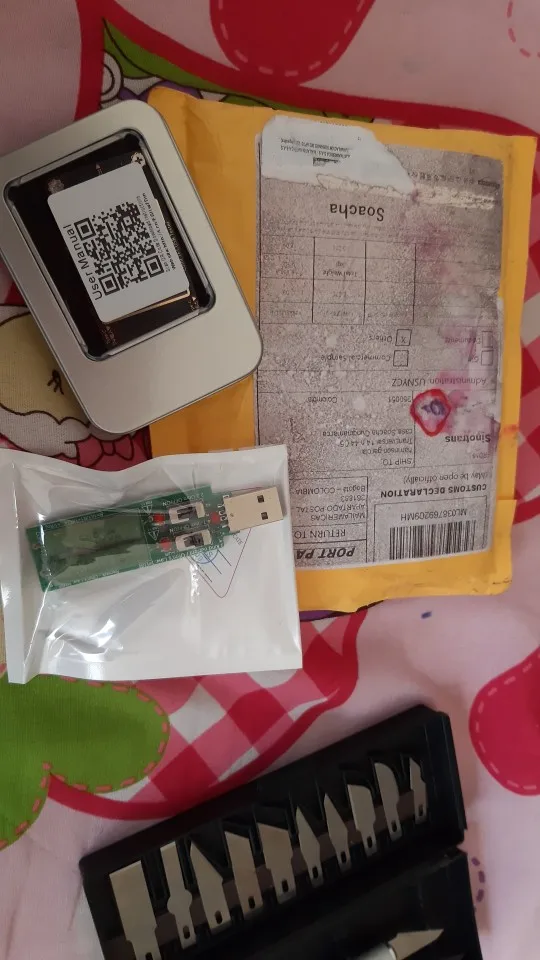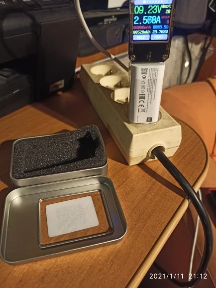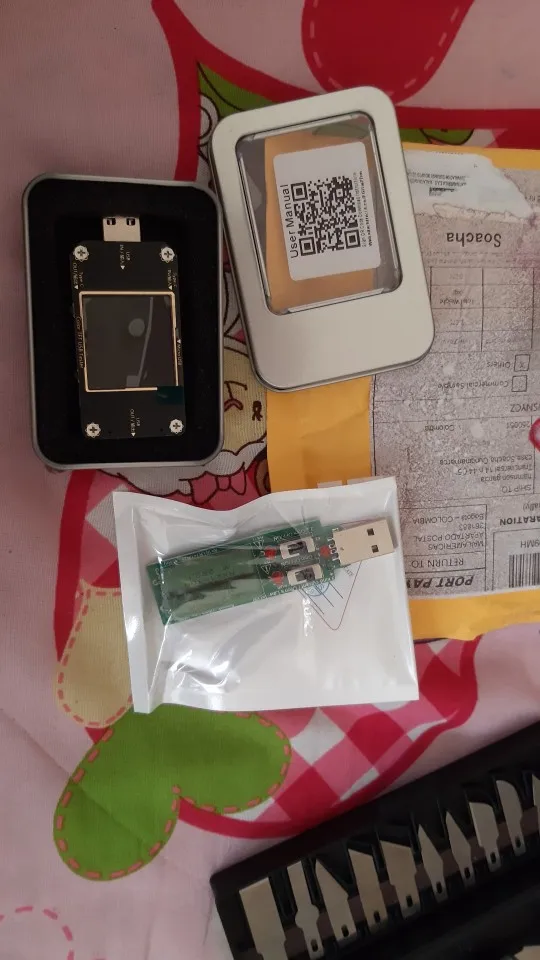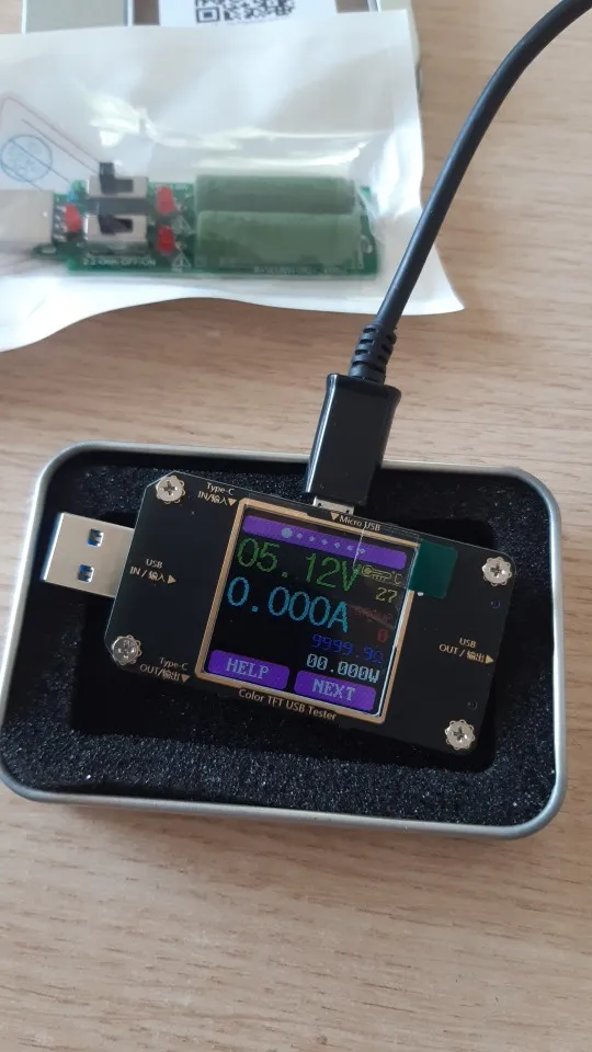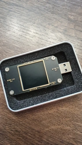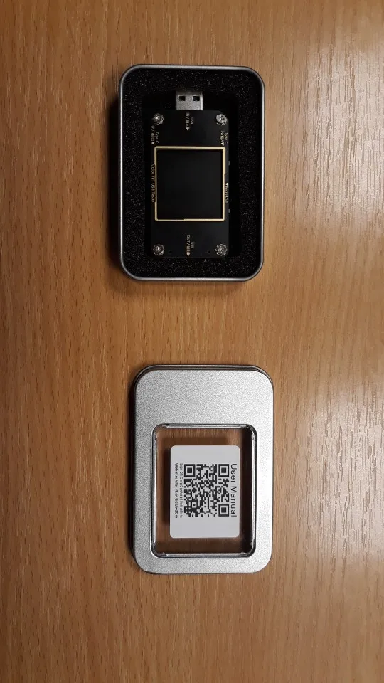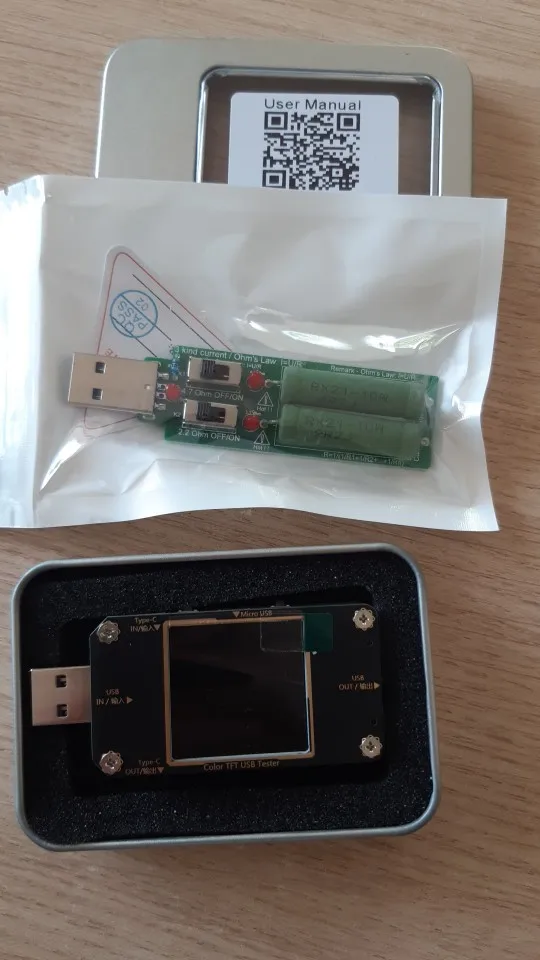 ЮСБ тестер, пришел через три недели. Для хранения служит прикольная жестяная коробочка, в комплект к тестеру идёт резистивная нагрузка на 0-1-2-3 А. Мануал нужно загружать по КюАр коду, почитаю, разберусь, чтобы использовать его возможности в работе.