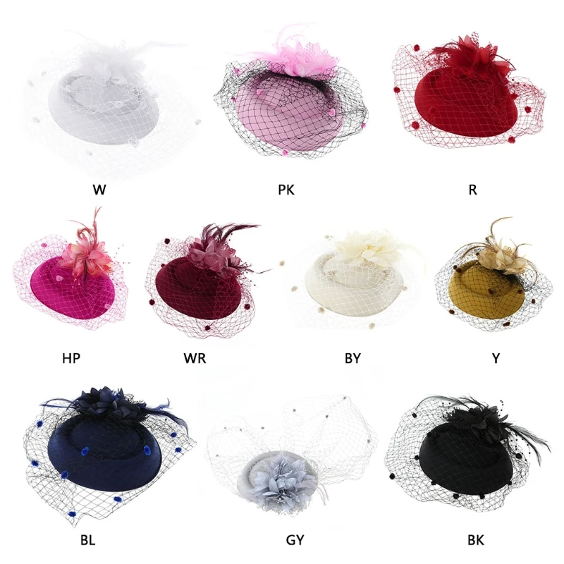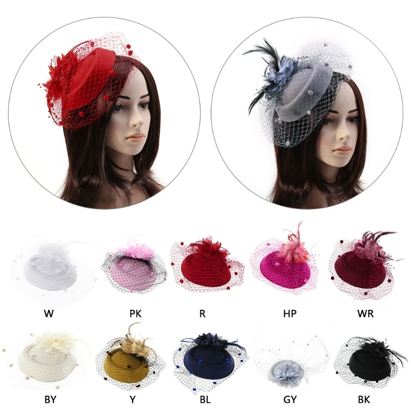 Лидер продаж 2018, 1 шт., Женская Вуалетка, ободок для волос, повязка на голову для девочек, шляпка-котелок с перьями, вуаль для свадебной вечеринки, 10 цветов