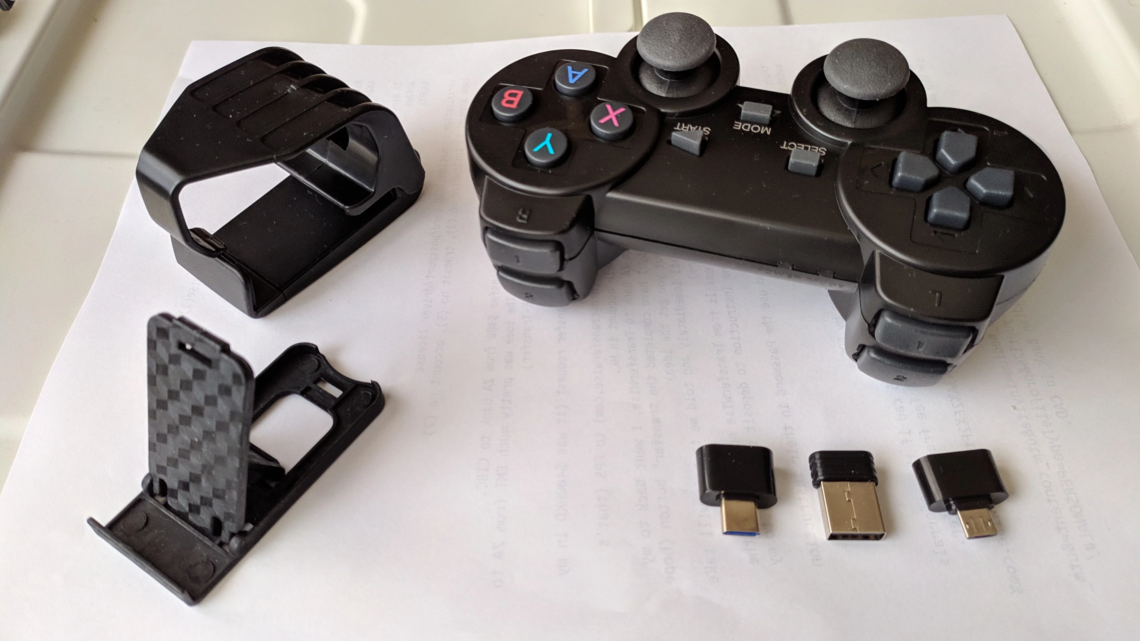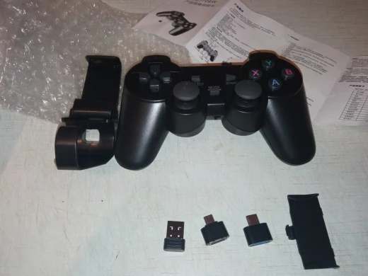 Нормальный геймпад. К ТвБоксу подключился. В комплекте три адаптера ( USB, micro USB и type C). Все отлично.