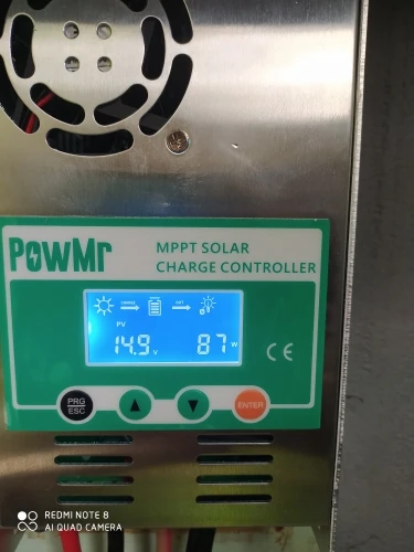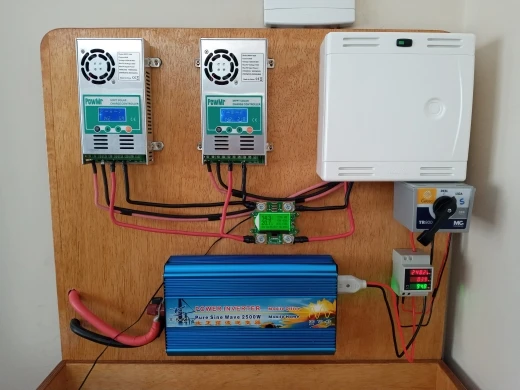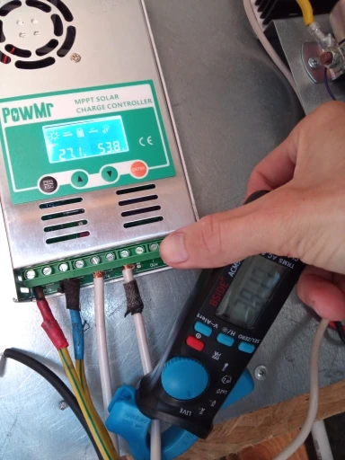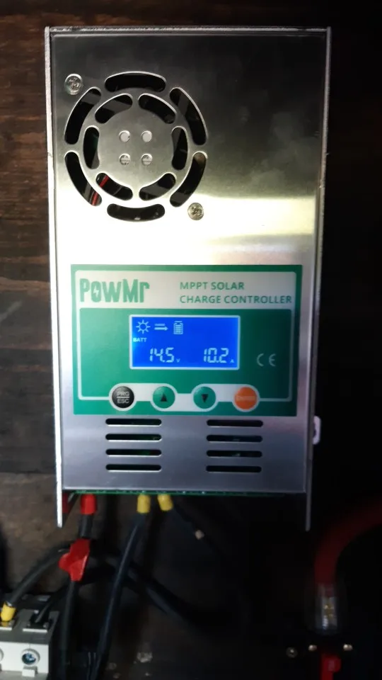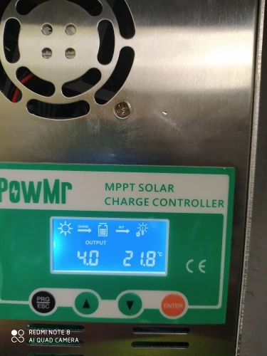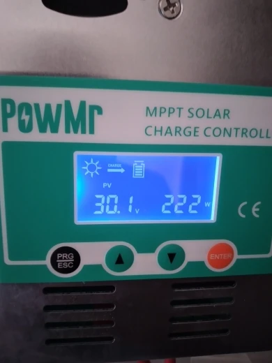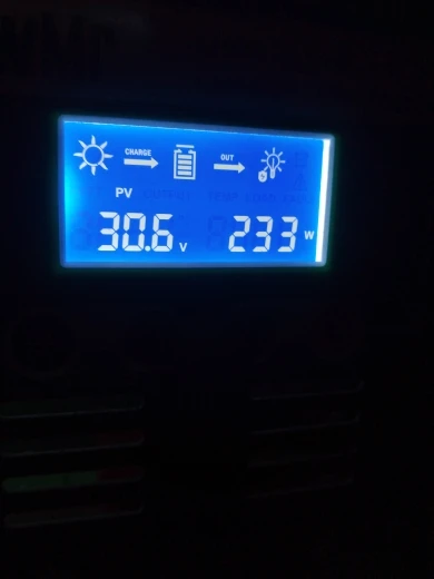 контроллер хороший, с MPPT , как и обещает продавец, заряжает аккумуляторы хорошо, но не обходится без глюков, это плохо. Если вы выключаете часть нагрузки (или всю) при полностью заряженном аккумуляторе, происходит неконтролируемое повышение напряжения заряда до 16-17 вольт, при этом инвертор уходит в защиту, а батареи получает встряску, все это длится несколько секунд, потом контроллер понимает, что надо уменьшить ток заряда и напряжение приходит в норму. Кроме того, при хорошем солнце может показывать напряжение от солнечных панелей 24-25 вольт, хотя по факту около 22 вольт, почему так происходит - не знаю. При сборке системы на высокие напряжения (24-48 и т.д. вольт) скорее всего проблем будет меньше. Для решения проблем с бросками напряжения, буду делать автоматическое отключение солнечных панелей на несколько секунд.