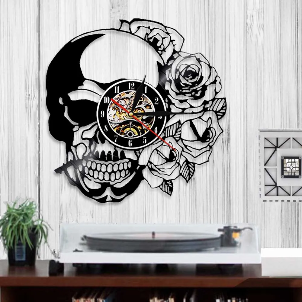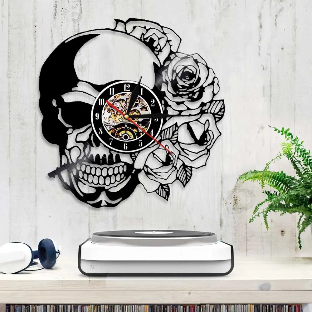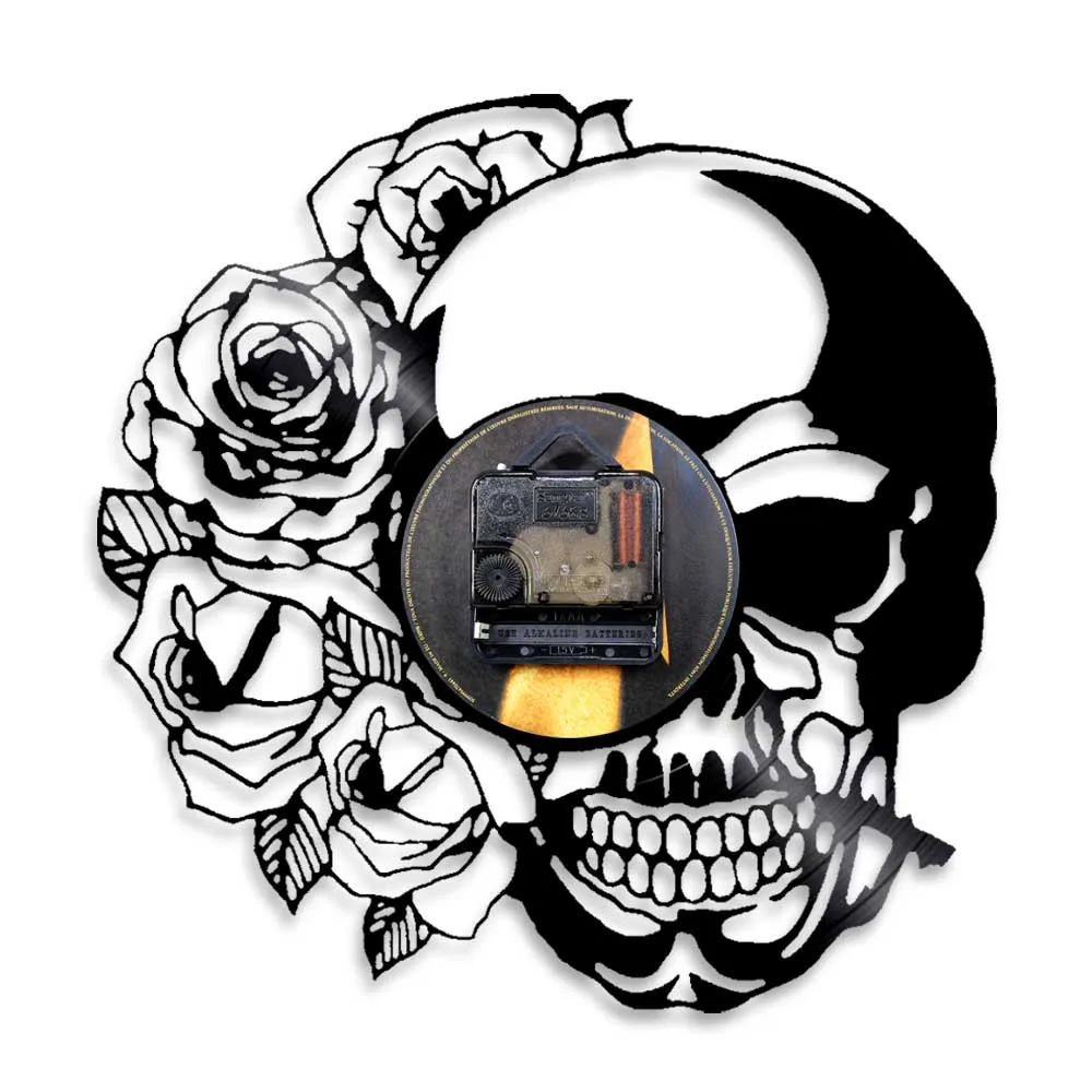 Хиппи Череп с розой художественная декоративная стена часы заводной Скелет Череп шип розы виниловые записи дома настенные часы Готический Декор