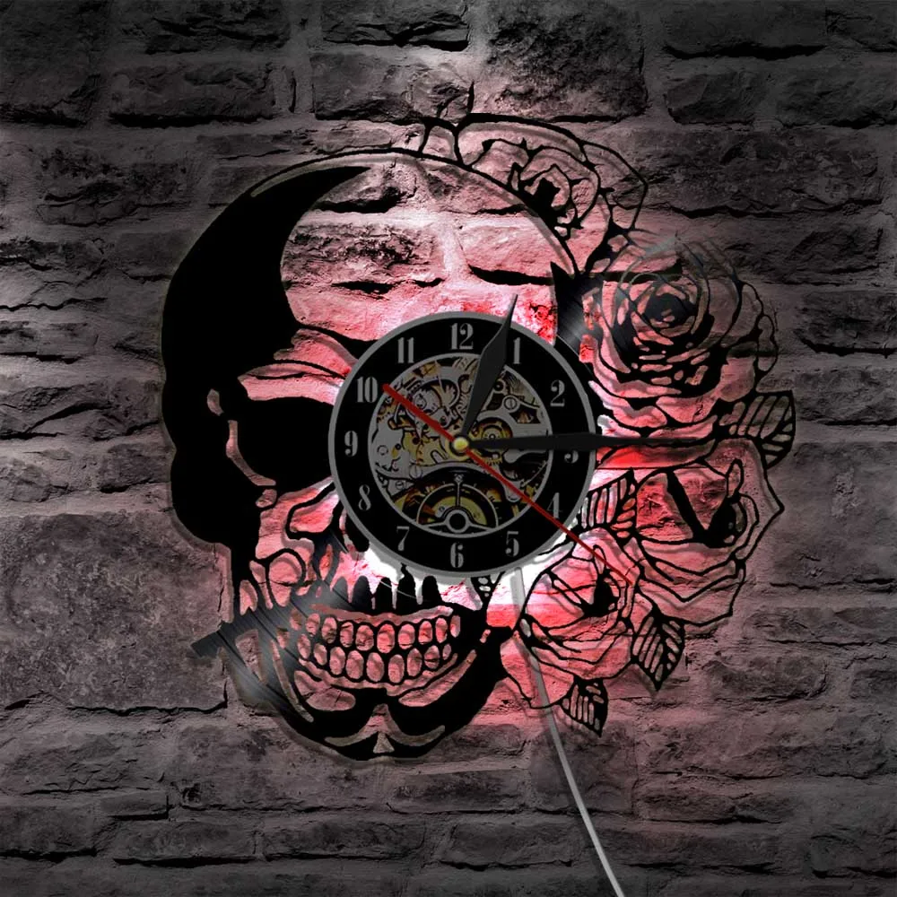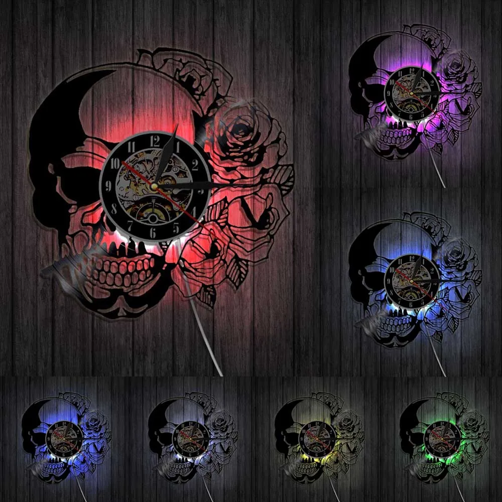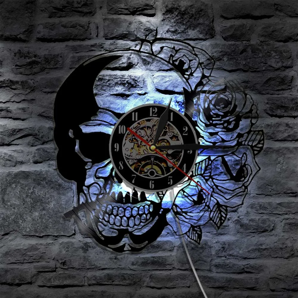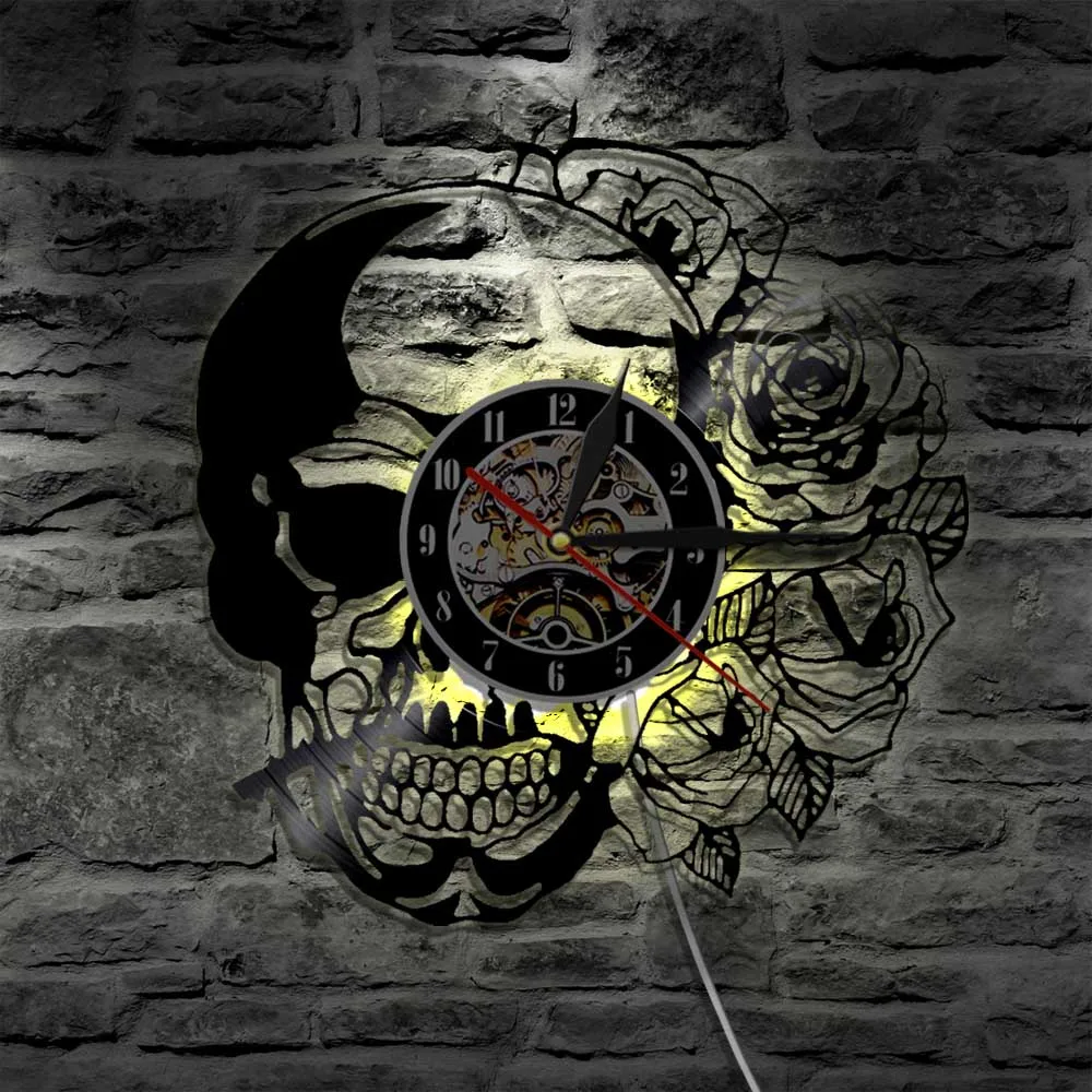 Хиппи Череп с розой художественная декоративная стена часы заводной Скелет Череп шип розы виниловые записи дома настенные часы Готический Декор