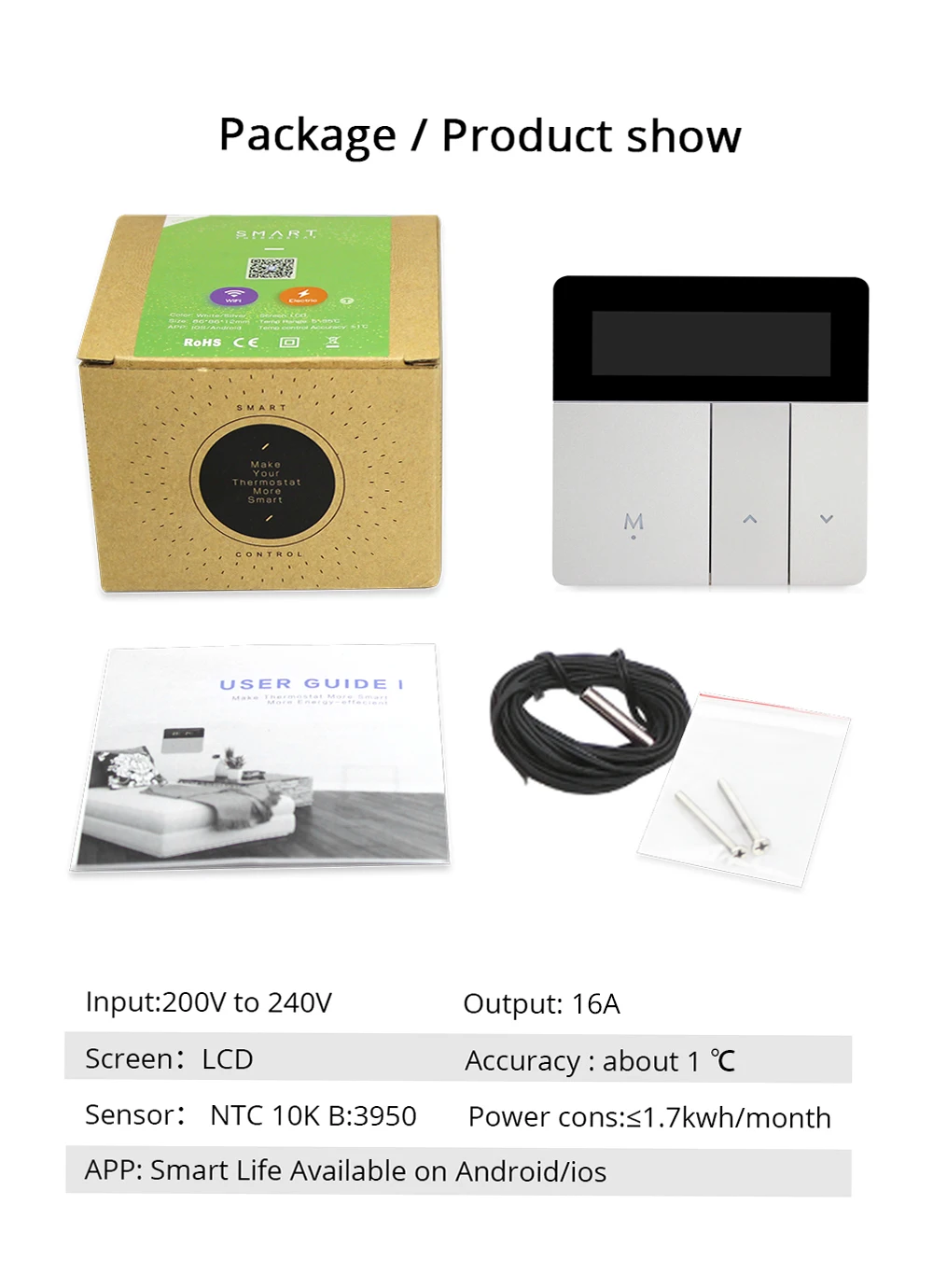 WiFi работает. smart life нашёл без проблем. Алиса, Гугл имеют возможность голосового управления этим термостатом. включить, выключить, поднять, опустить температуру без проблем. пока всё нравится. выносной датчик температуры имеется.