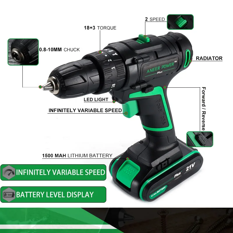 Дрель ударная беспроводная, 21 в, 1500 ма ч, с литиевым аккумулятором